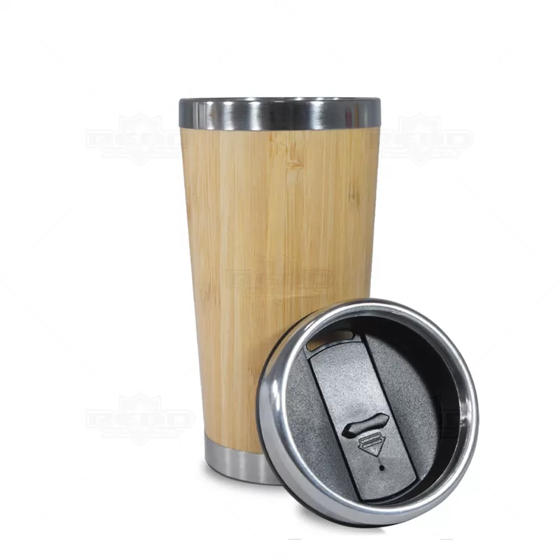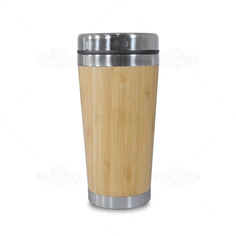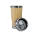 Copo personalizado produzido em inox com revestimento externo em bambu e capacidade para 500ml. Possui tampa rosqueável com anel de vedação, abertura superior retrátil facilitando o consumo e base com acabamento em inox. Ideal para brindes promocionais e eventos corporativos.
