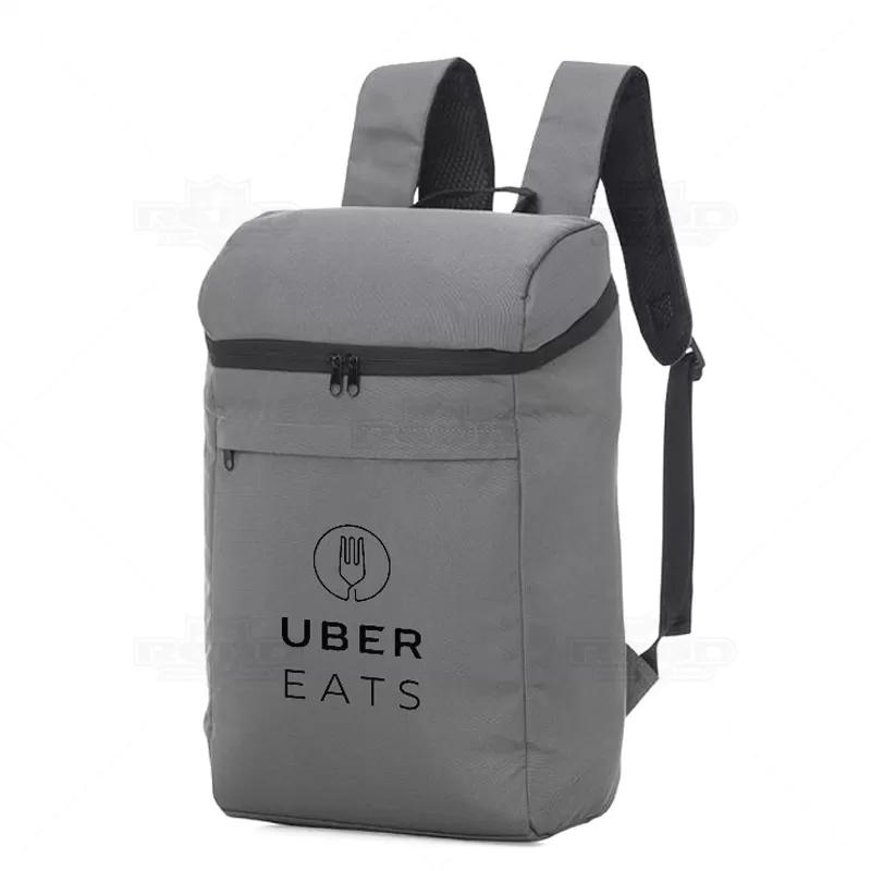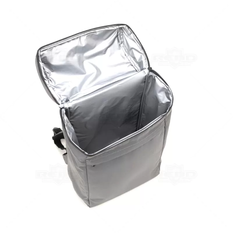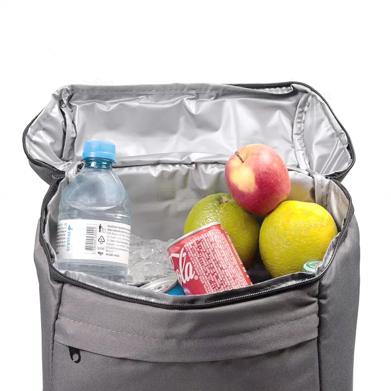 Mochila térmica personalizada produzida em tecido poliéster. Possui compartimento interno com capacidade para 16 litros, bolso frontal, alça de mão e ombro e parte interna soldada para retenção de líquidos. Ideal para brindes promocionais e eventos corporativos. Imagem ilustrativa, itens decorativos não acompanham o produto.