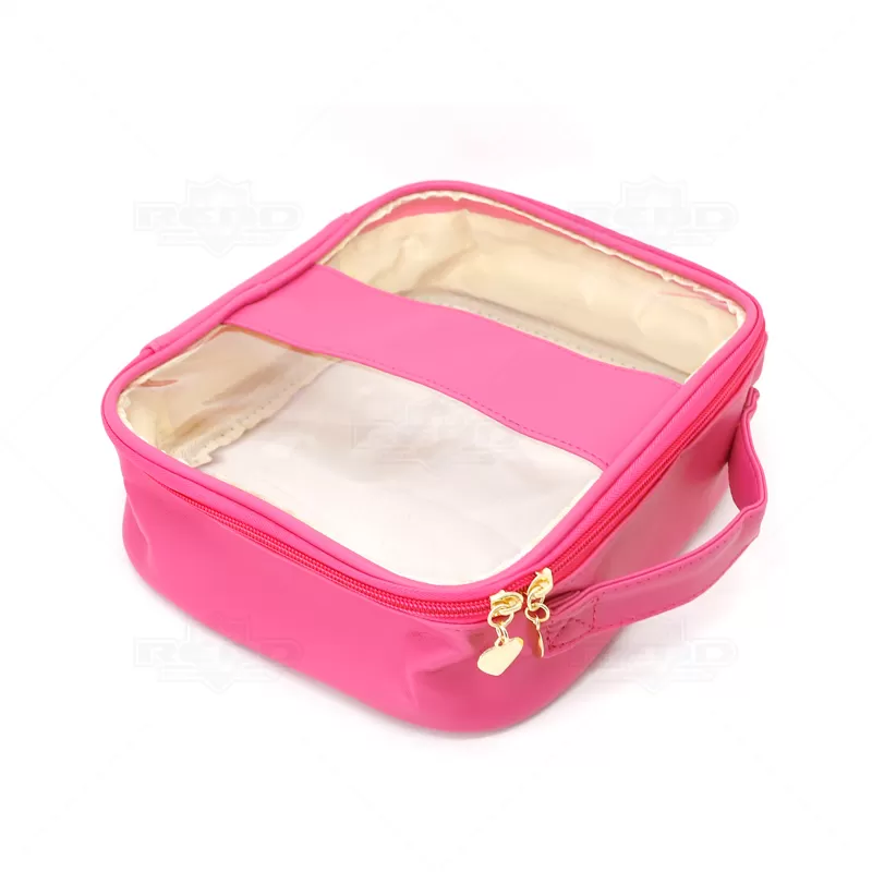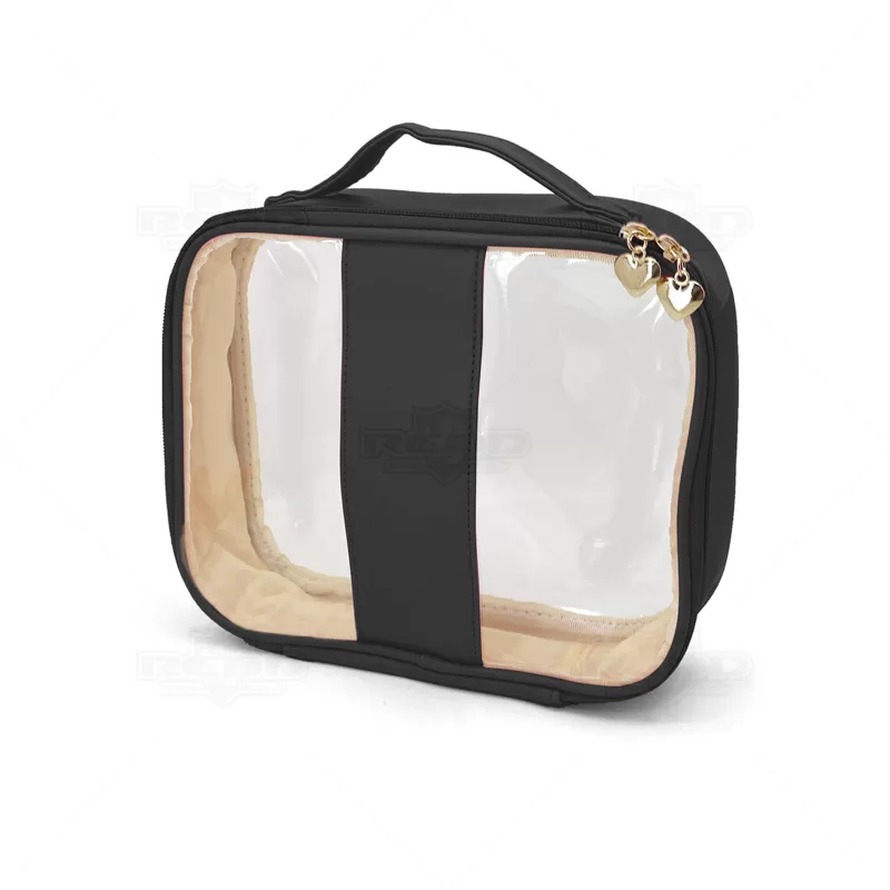 Necessaire personalizada produzida em material sintético, possui alça de mão, ambos os lados em PVC cristal com reforço em poliéster vivo nas extremidades, compartimento interno com fechamento por zíper e cursor de metal em formato coração. Perfeita para lhe acompanhar em viagens e até mesmo transportar seus itens pessoais do dia a dia com organização e praticidade. Ideal para brindes promocionais e eventos corporativos.