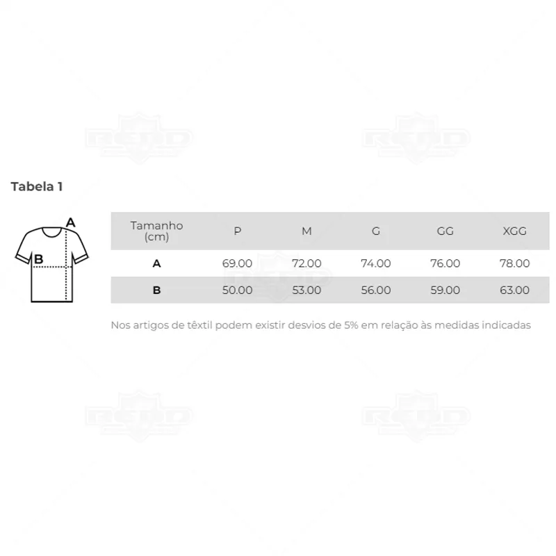 Camiseta unissex de corte regular em malha 100% algodão (135 g/m2) com fio 30/1 misto. Com gola em ribana 1,5x1,5 com fita de reforço e com costura dupla nas mangas, barra de fundo e laterais. Personalização em transfer 280 X 200 mm. Tamanhos: P (A69 x B50cm), M (A72 x B53cm), G (74 x 56cm), GG (A76 x B59cm), XGG (78.0 x 63.0). Obs: Nos artigos de têxtil podem existir desvios de 5% em relação às medidas indicadas.