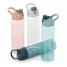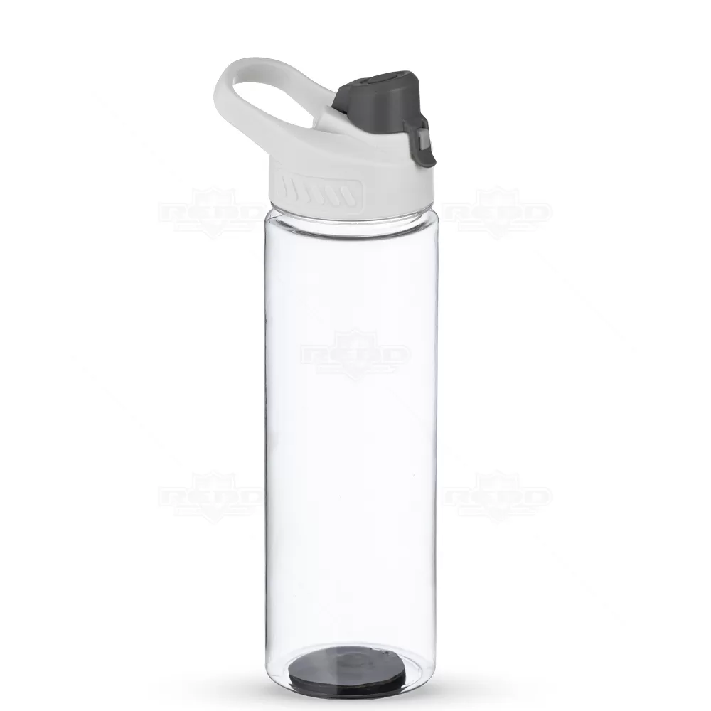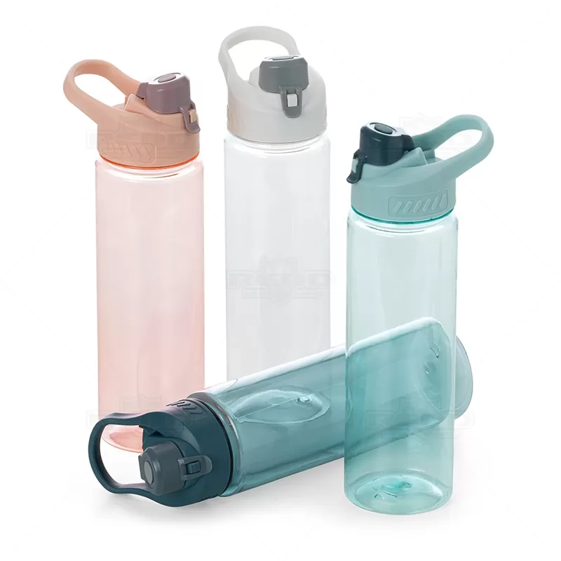 Squeeze plástico personalizado, com capacidade de 700ml, possui alça para transporte, tampa principal rosqueável e tampa de proteção plástica com trava para o bocal. Ideal para práticas esportivas, brindes promocionais e eventos corporativos.