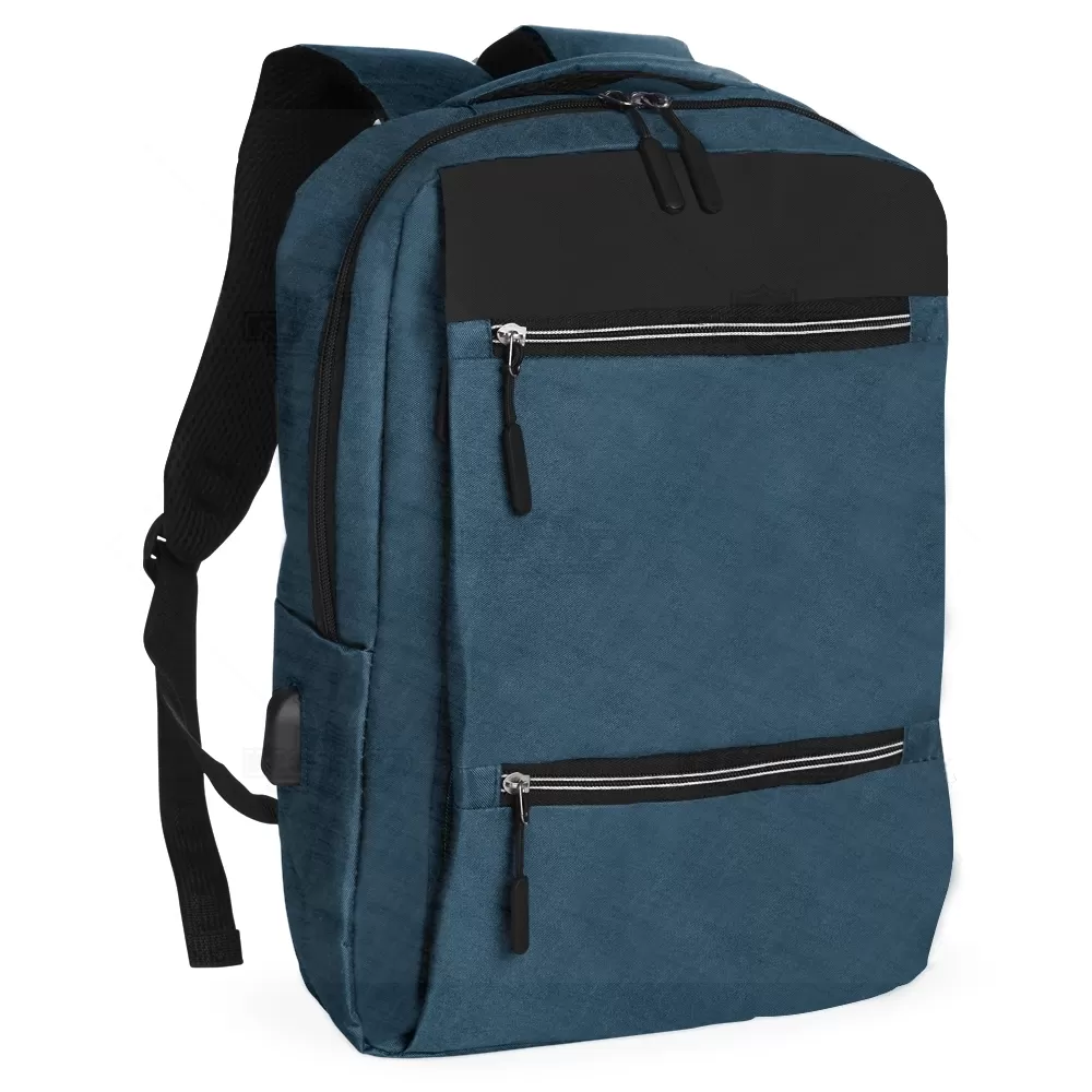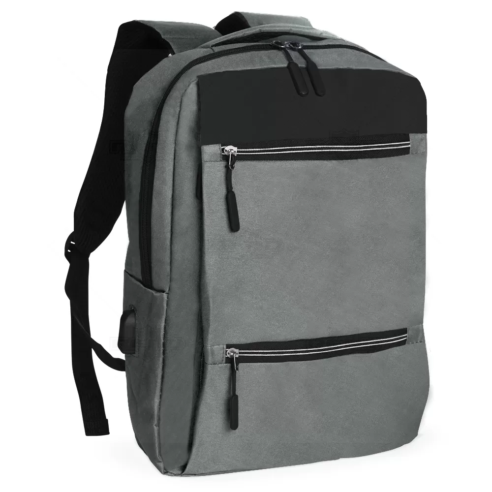 Mochila confeccionada em nylon com compartimento para notebook até 15,6 polegadas. Contém compartimento grande com divisórias para documentos, eletrônicos e caneta, dois compartimentos frontais com abertura horizontal, bolso lateral e adaptador USB externo com cabo acoplado, permitindo a conexão de um carregador portátil de dentro da mochila e transferência da carga para o lado externo, ocultando o carregador e viabilizando a utilização do celular durante o processo. Contém zíperes com pegadores plásticos, alça de mão em nylon, alças para as costas ajustáveis com revestimento espumado antitranspirante e alça horizontal para encaixe em malas de viagem. Ideal para brindes promocionais e eventos corporativos. Imagem ilustrativa.