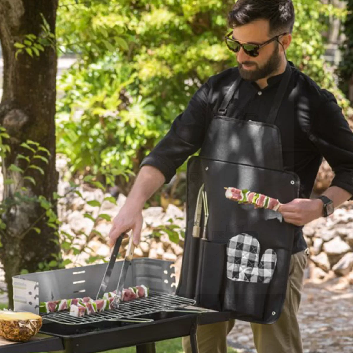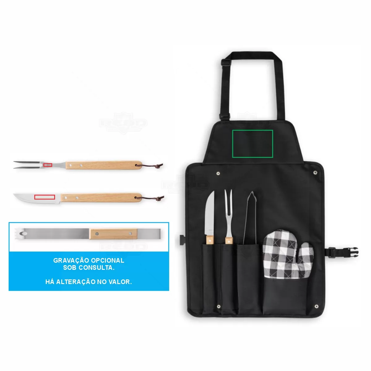Kit churrasco personalizada composto por 4 utensílios. Possui 1 faca, 1 garfo e pinça em aço inox e madeira de seringueira e uma luva de cozinha. O estojo dobrável em 600D pode ser convertível em avental para sua proteção. Próprio para contato com alimento. Ideal para brindes promocionais e eventos corporativos. Imagem Ilustrativa.