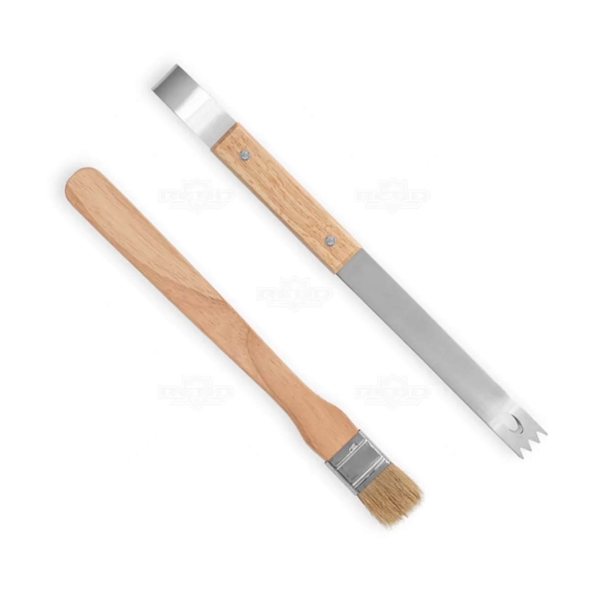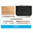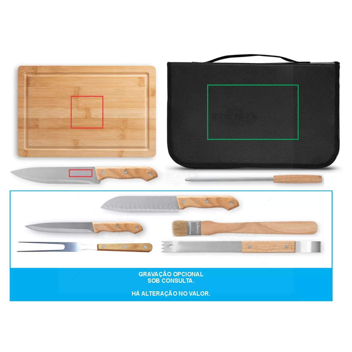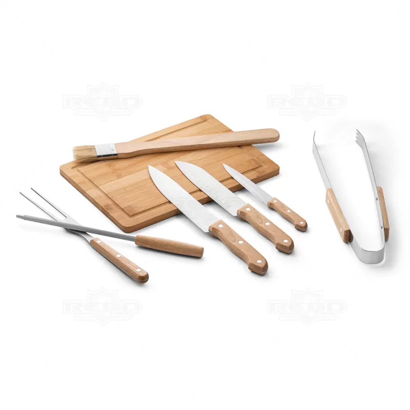 Kit churrasco personalizado com em estojo em tecido sintético PU e 210D. Composto por 1 tábua em bambu e 7 utensílios em aço inox com cabo em madeira de seringueira: faca japonesa, faca chefe, garfo, pinça, faca pequena, afiador e pincel. Próprio para contato com alimento. Estojo: 250 x 370 x 45 mm | Tábua: 300 x 200 x 11,6 mm. Ideal para brindes promocionais e eventos corporativos. Imagem ilustrativa.
