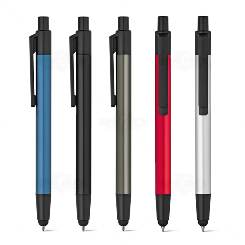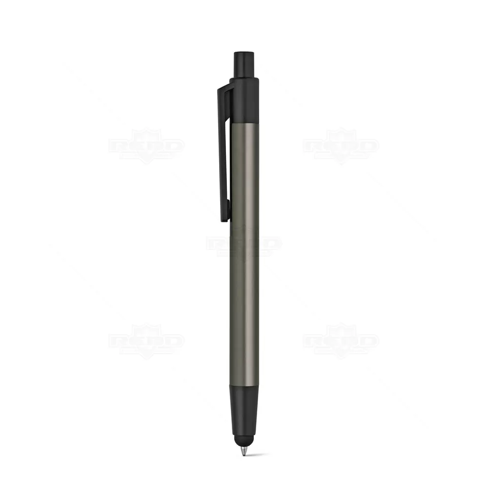 Caneta de metal personalizada, com ponteira touch para uso em tablets, smartphones e aparelhos touch screen, esferográfica na cor azul com acionamento por click. Ideal para brindes promocionais e eventos corporativos.