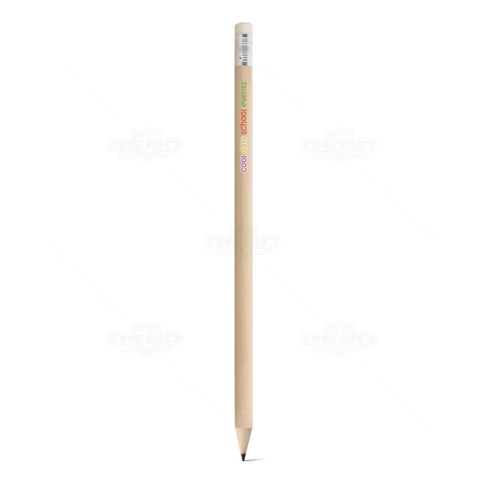Lápis personalizado formato redondo ergonômico, produzido em madeira com borracha branca em suporte de metal e ponta com grafite resistente. Ideal para divulgar sua empresa em eventos corporativos, brindes personalizados e campanhas promocionais.