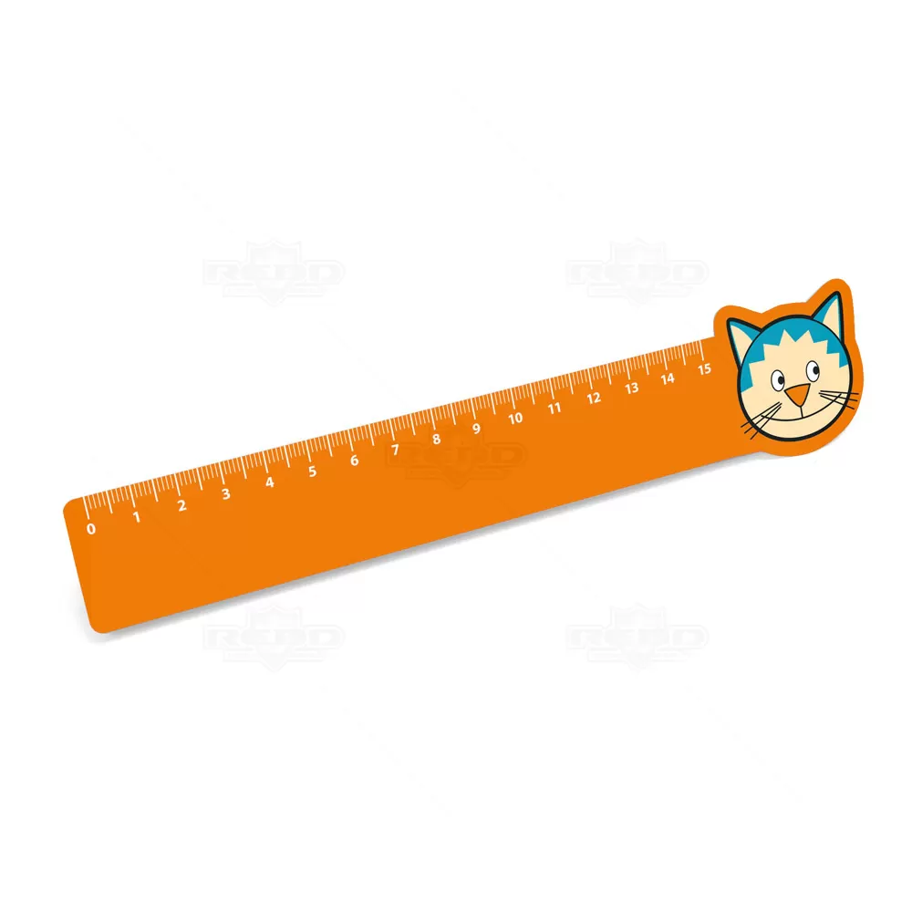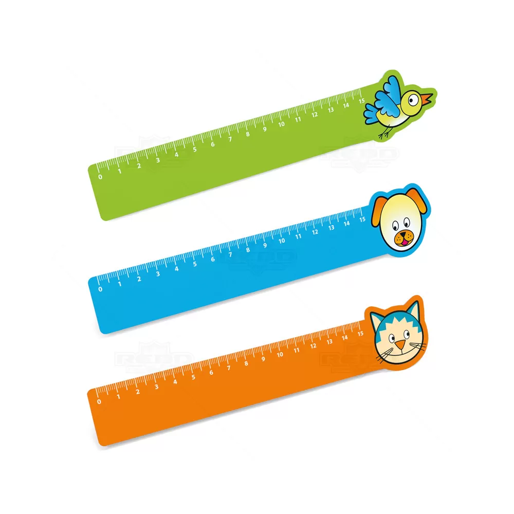 Régua com escala de 15 cm personalizada com desenhos infantis de animais. ( Gato, Cachorro e Pássaro) Produzida em PP flexível e escala impressa em branco. Pode ser utilizado tanto na escola quanto em demais trabalhos diários. Ideal para brindes promocionais e eventos corporativos.