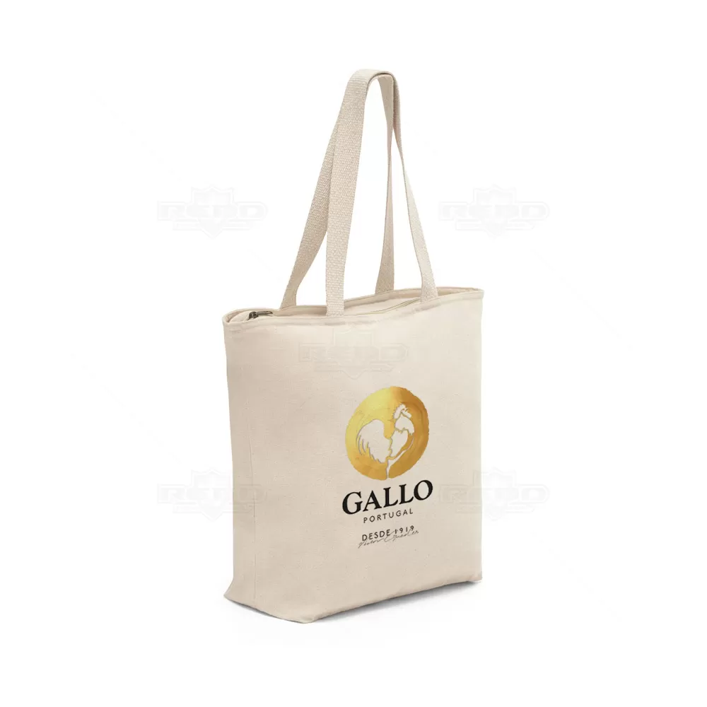 Sacola ecológica personalizada produzida em 100% algodão (280 g/m²) possui amplo espeço interno e 1 bolso interior para guardar pequenos objetos pessoais, ambos com fechamento por zíper. Alças em algodão webbing com 65 cm. Ideal para brindes promocionais e eventos corporativos.