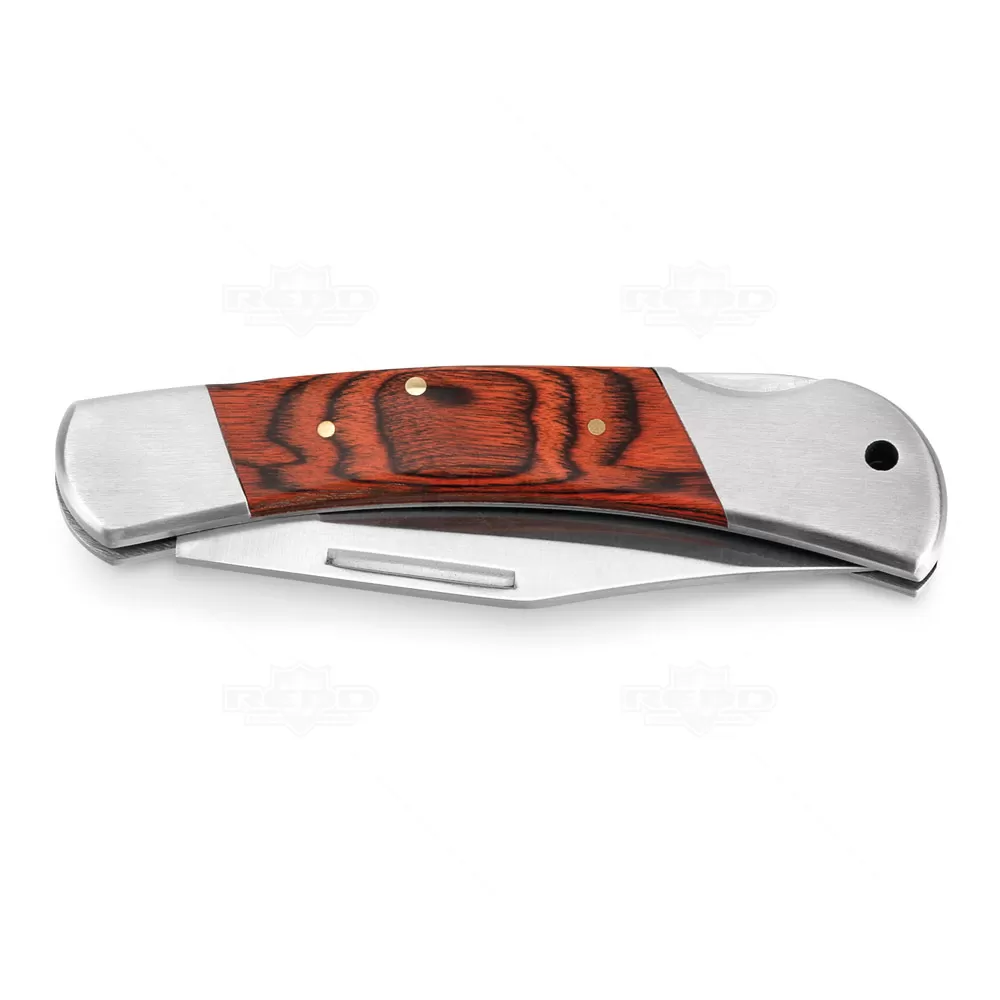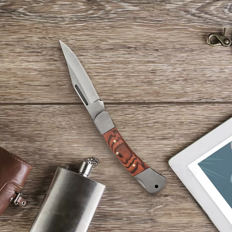 Canivete de metal personalizado produzido em aço inox e detalhe em madeira trabalhada com fecho de segurança. Possui design moderno e arrojado, ele é muito útil para o seu dia-a-dia em diversas atividades tais como: Camping, caça, esportes radicais, resgates, primeiros socorros, pescarias, viagens e até mesmo em pequenos serviços e/ou reparos dentro do seu lar. Ideal para brindes promocionais e eventos corporativos. Imagem ilustrativa.