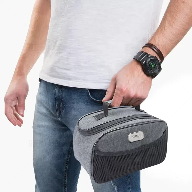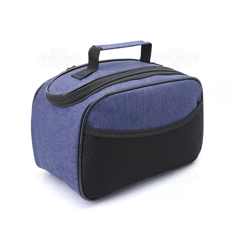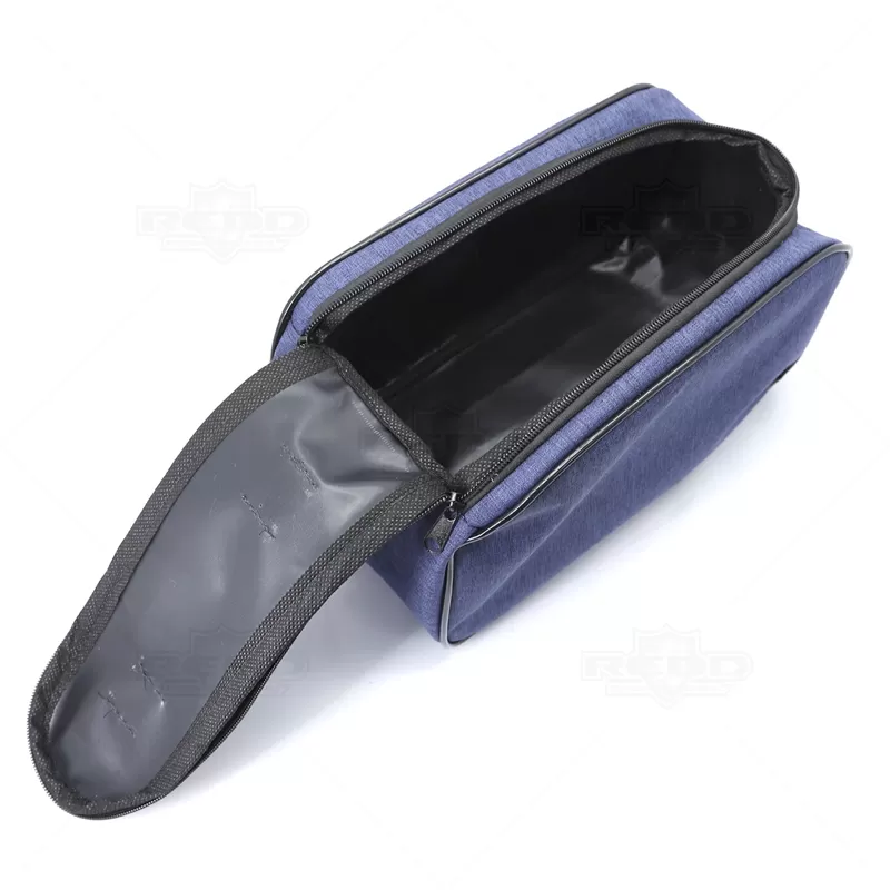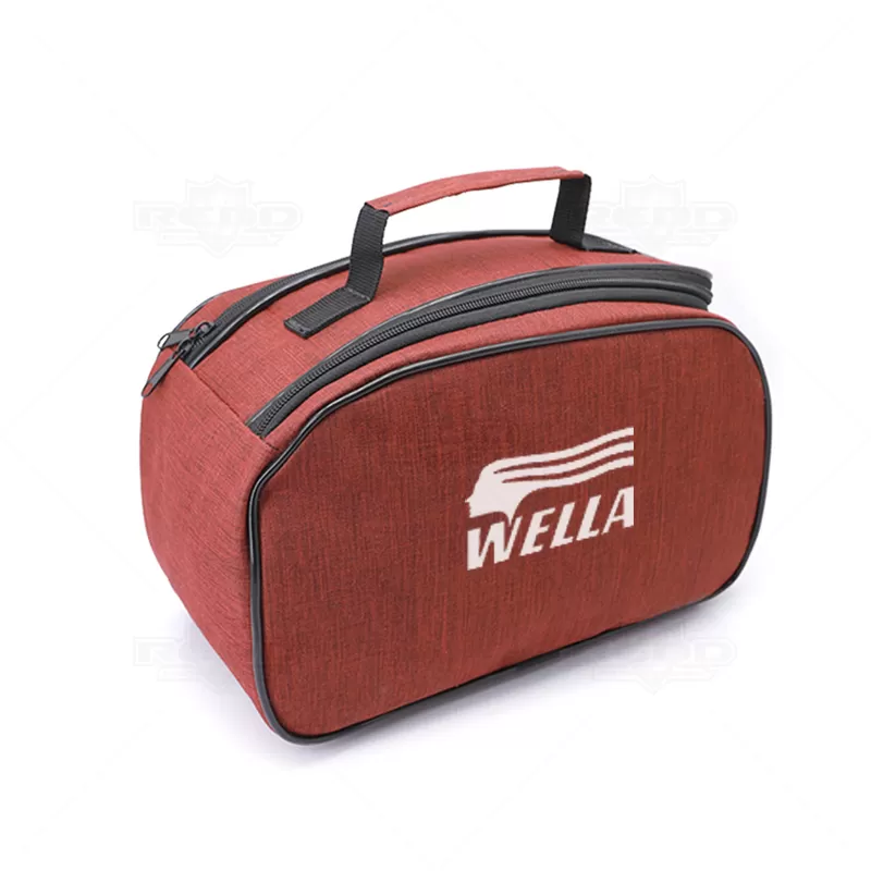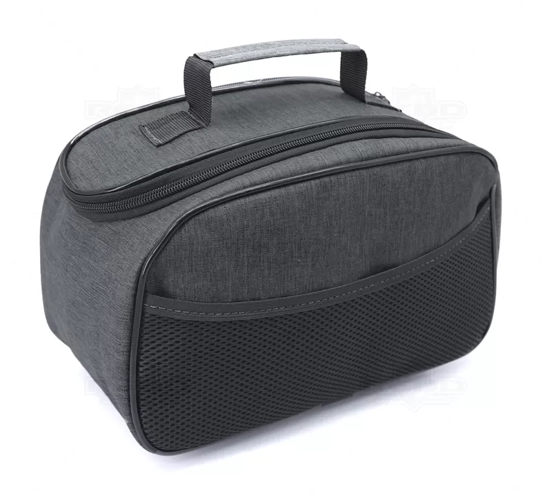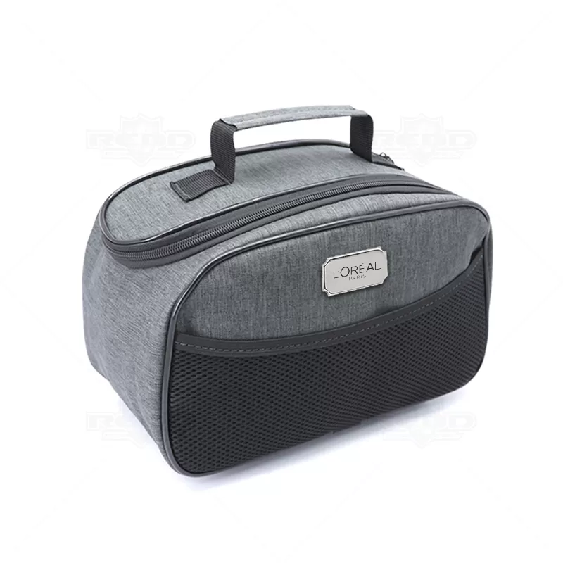 Necessaire personalizada produzida em nylon. Possui alça de mão confortável, 2 cursores diferenciados, bolso frontal em telinha, amplo espaço interno para guardar maquiagem, cremes, produtos para higiene diária, pentes, remédios e objetos em geral do dia dia. Ideal para brindes promocionais e eventos corporativos. Imagem ilustrativa.