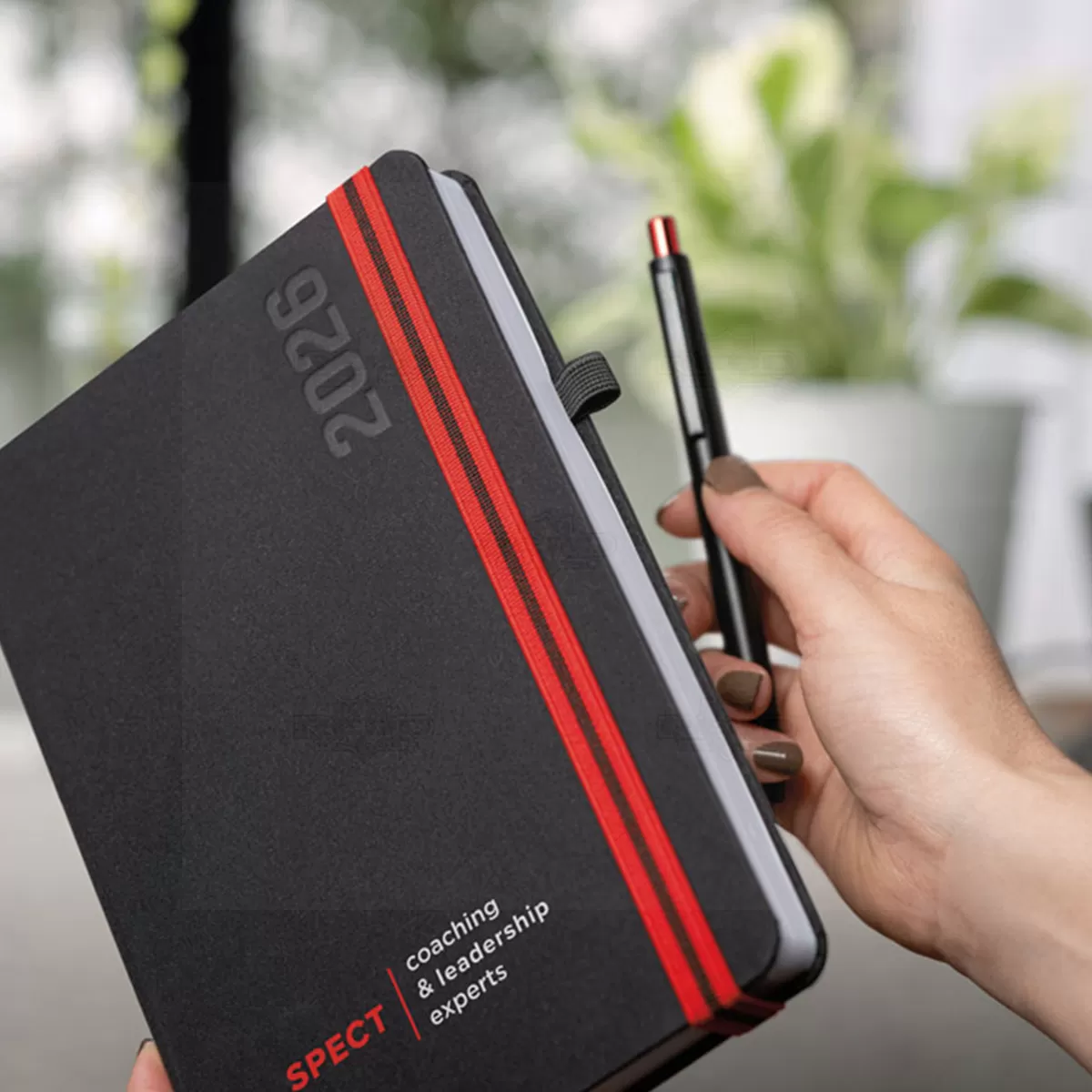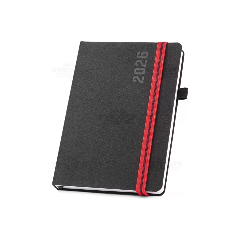 Agenda diária personalizada formato A5 e acabamentos em poliéster. Possui plano diário, folhas internas brancas, elástico para fechamento e suporte para esferográfica (não inclusa). A agenda possui o tamanho perfeito para levar em sua bolsa ou mochila sem ocupar espaço, perfeito para armazenar anotações e a organização do dia a dia, em casa ou no trabalho. Ideal para ações destinadas a escritório e distribuições em ações de marketing e brindes.