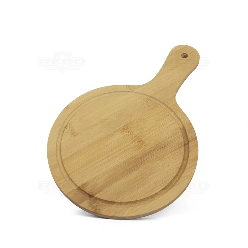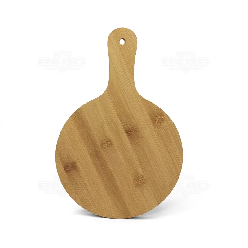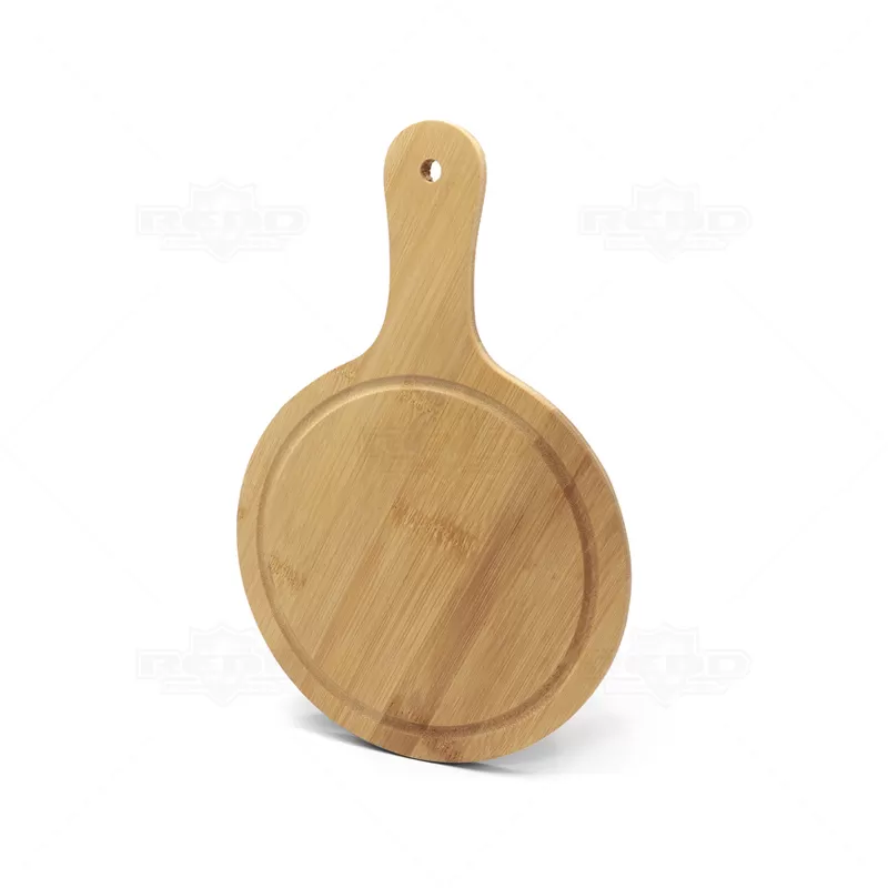 Tábua de corte personalizada produzida em bambu formato redondo com sulcos nas extremidades e com cabo para servir. Ideal para ser usada para apoiar travessas na mesa, petiscos gourmet, palmitos, pizza brotinho, queijos frios e demais delícias de tira gosto, desde os legumes até o corte de carnes do seu churrasco. Durável e higiênica, o bambu é um material resistente e com propriedades que evitam a proliferação de bactérias. Ideal para eventos corporativos e brindes promocionais. Imagem Ilustrativa.