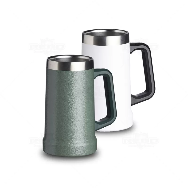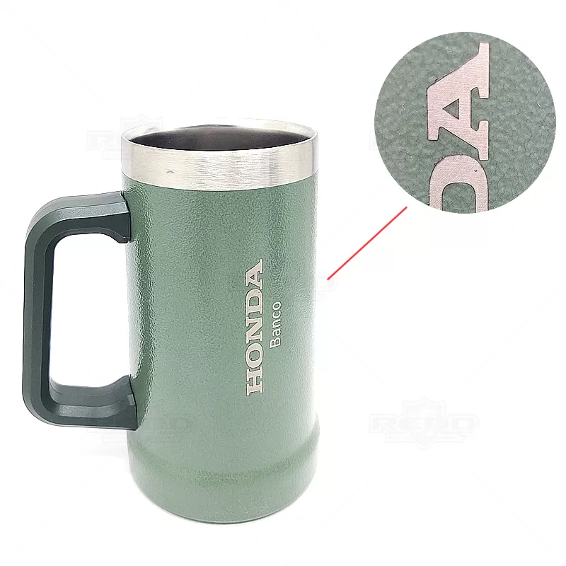 Caneca térmica personalizada produzida em aço inox com parede dupla com isolamento a vácuo que conserva a temperatura da bebida por mais tempo. Possui alça plástica resistente e capacidade para 700ml. Compacta e portátil, conveniente para você carregar em qualquer lugar. Ideal para eventos corporativos, gastronômicos e brindes promocionais personalizáveis com seu logo.