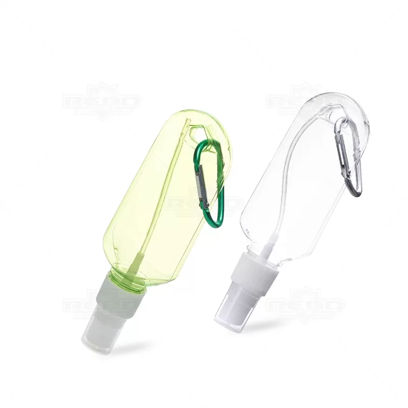 Frasco para álcool em gel personalizado, com válvula spray e capacidade para 100ml. Perfeito para utilização de álcool líquido (não incluso), tampa transparente com encaixe rosqueável e acompanha chaveiro mosquetão de metal com trava de pressão. Imagem ilustrativa.