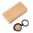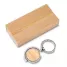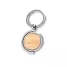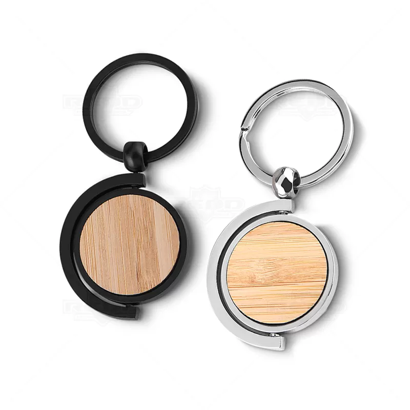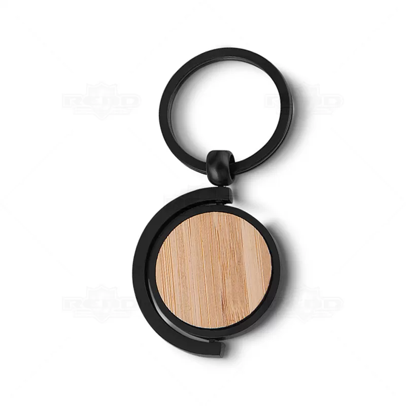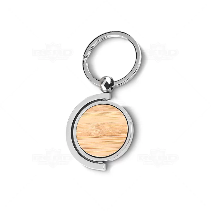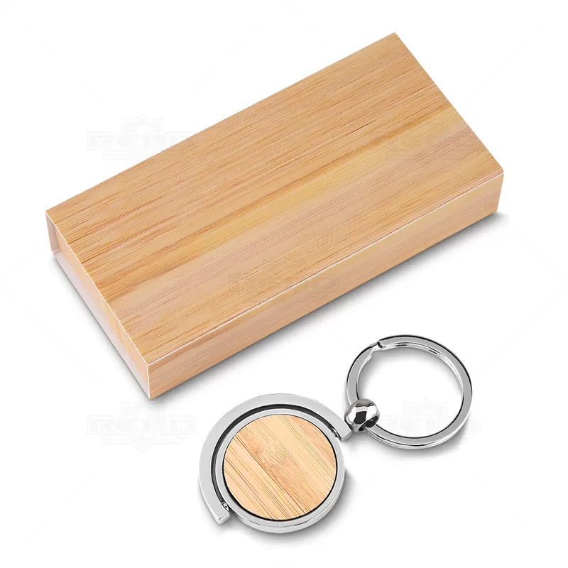 Chaveiro de metal personalizado com detalhe em bambu. Possui argola de metal, central giratória com acabamento em bambu e embalagem com impressão simulando bambu. Ideal para brindes promocionais e eventos corporativos.
