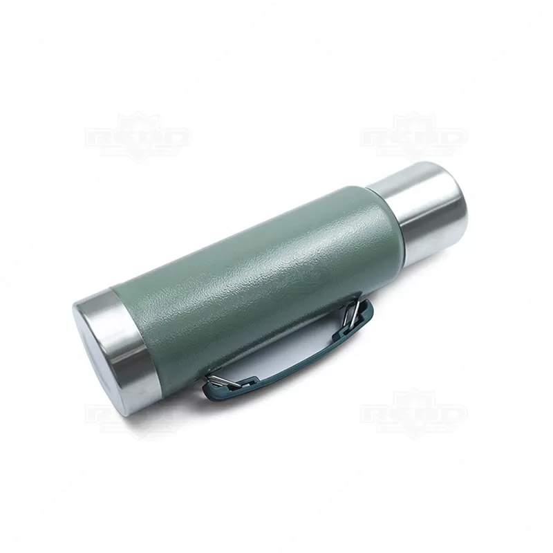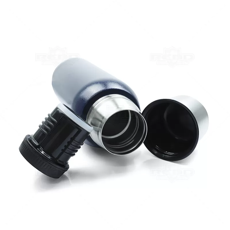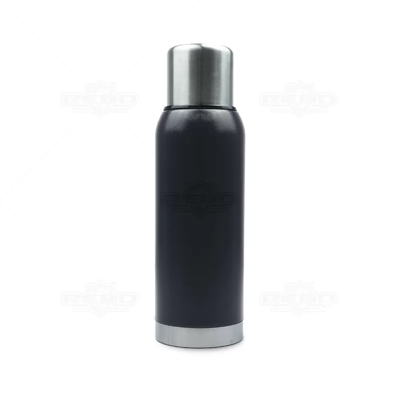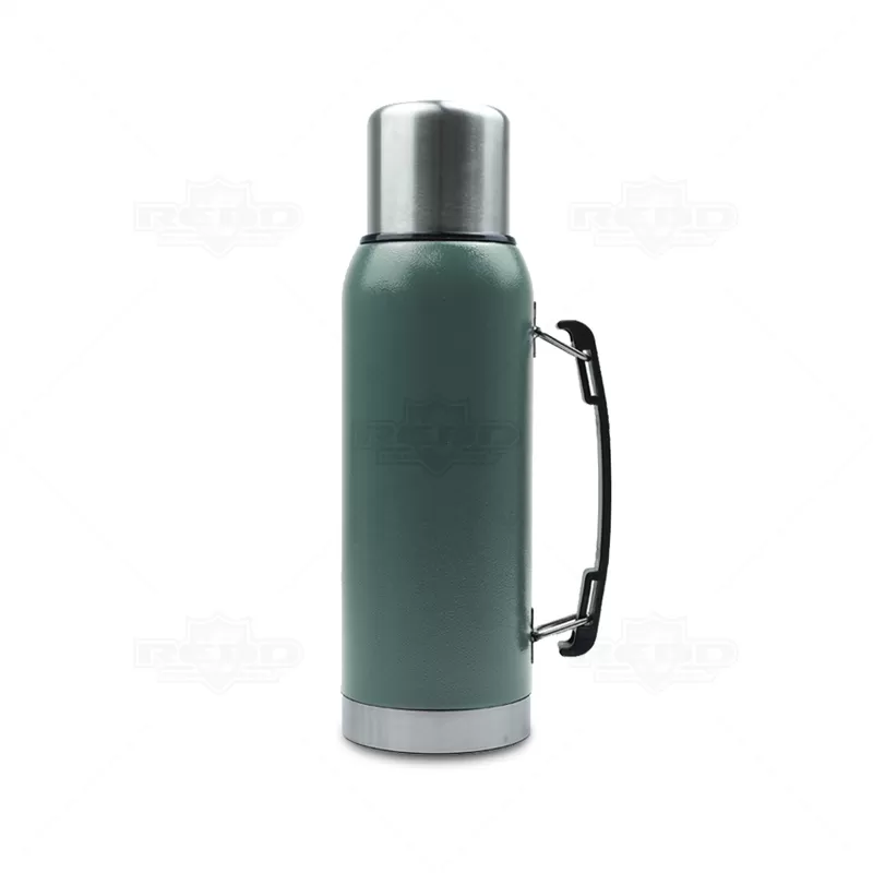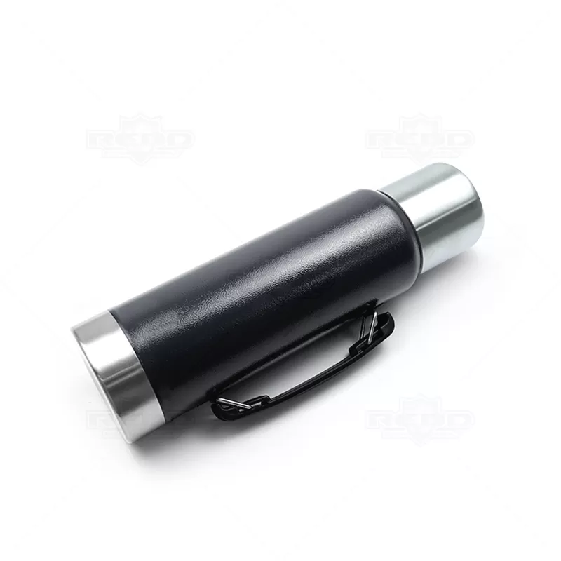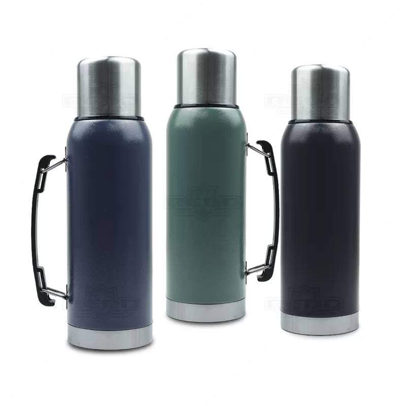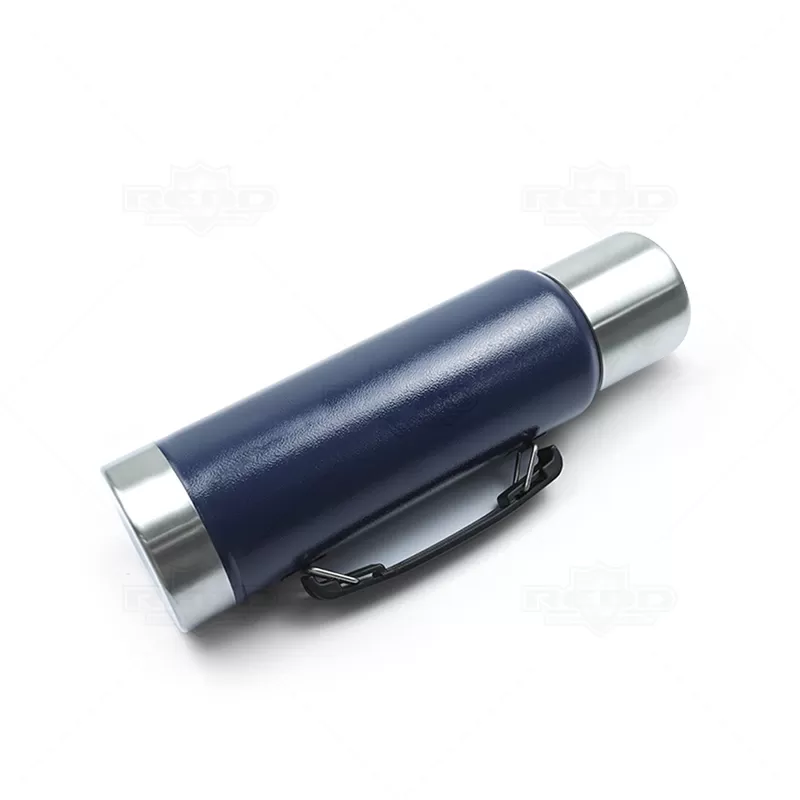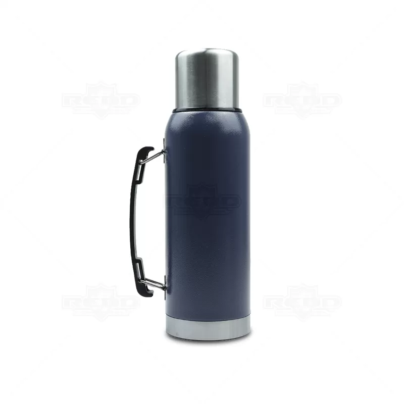 Garrafa térmica 1000ml personalizada, produzida em aço inox com parede dupla e isolante a vácuo que conserva sua bebida quente ou gelada por mais tempo. Possui tampa protetora em inox que pode ser utilizada como copo com interior em plástico resistente, alça de mão lateral plástica, tampa rosqueável com anel para o liquido não derramar, base inferior em inox. Ideal para brindes promocionais, convenções gastronômicas e eventos corporativo.