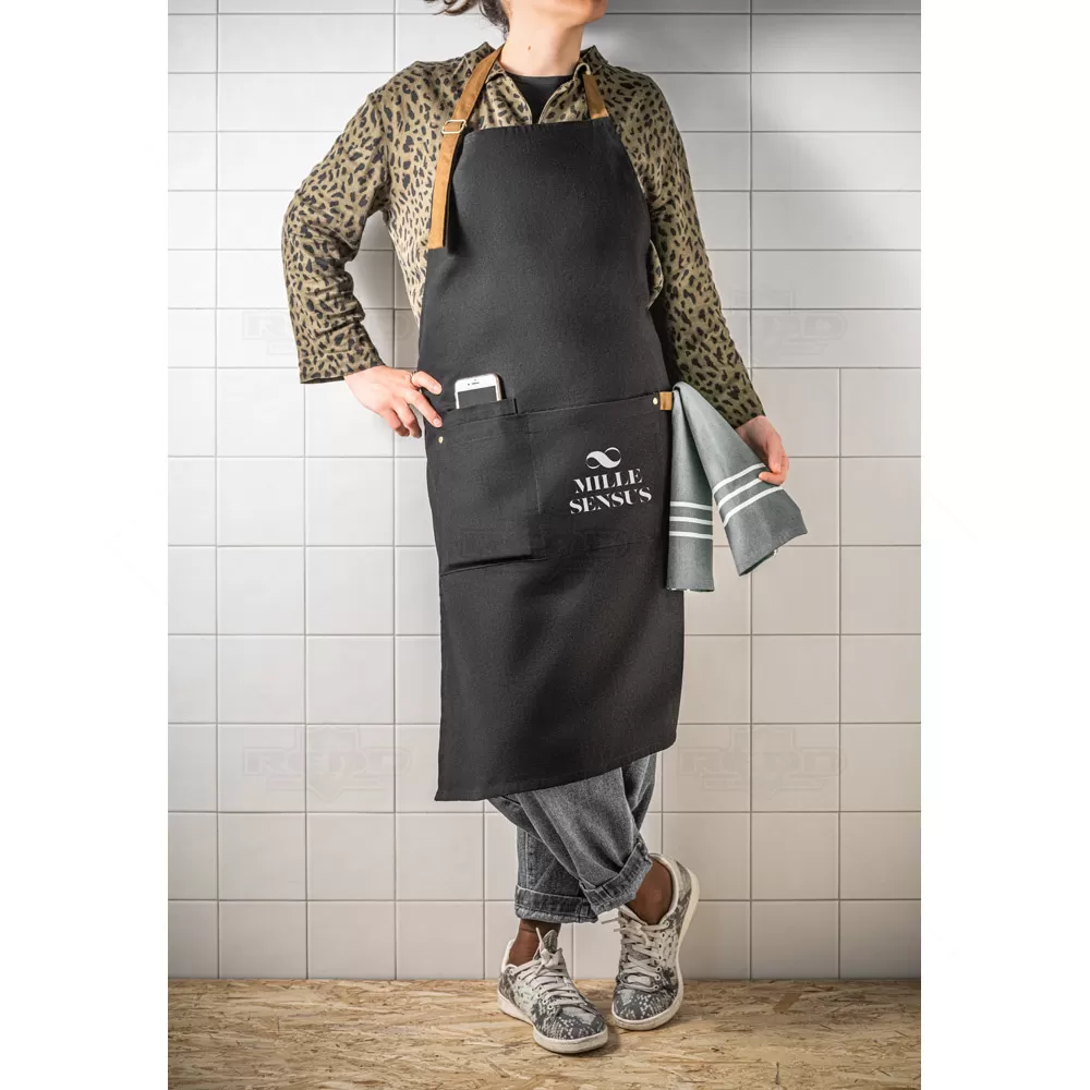 Avental personalizado produzido em 100% algodão canvas (300 g/m²) com detalhes em metal. Com 3 bolsos multifuncionais e uma tira lateral (para suporte de um pano de cozinha). Tira do pescoço facilmente ajustável e tiras em tecido para amarrar ajustando ao seu corpo.