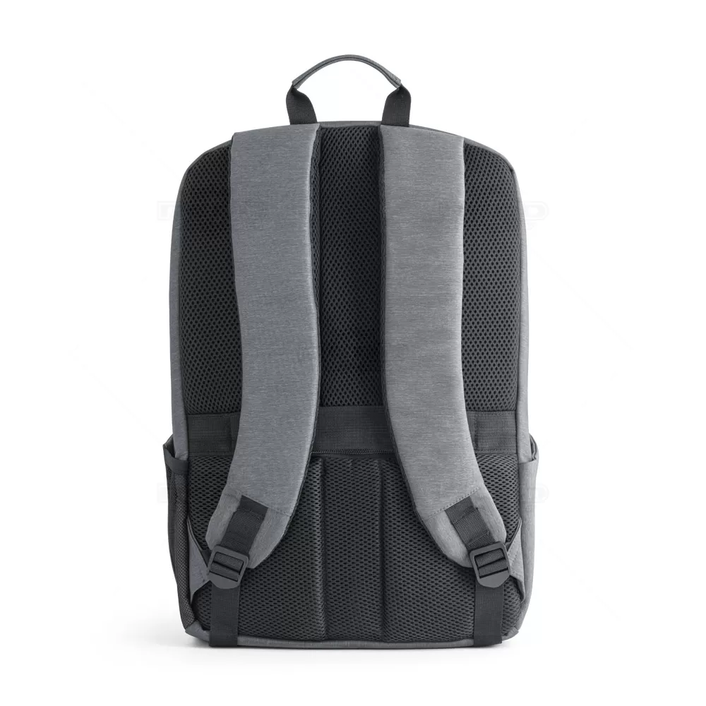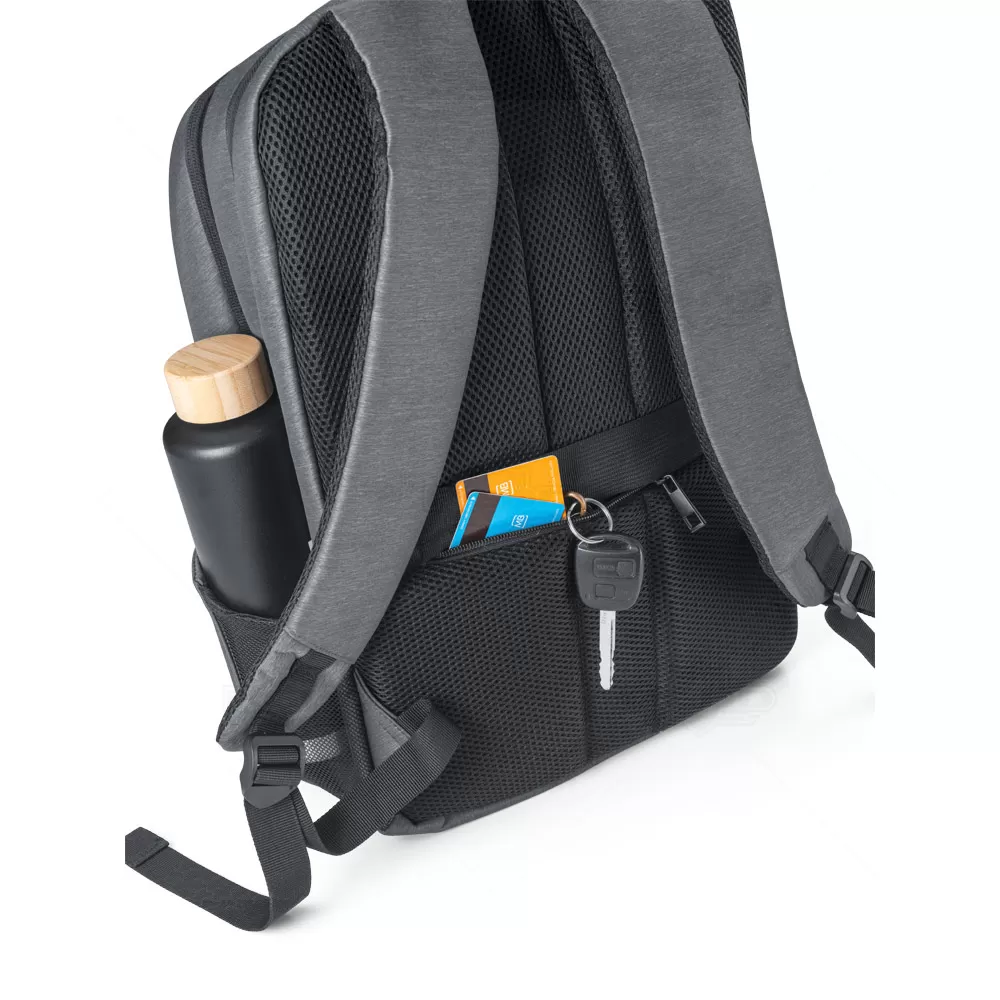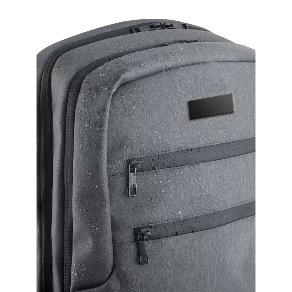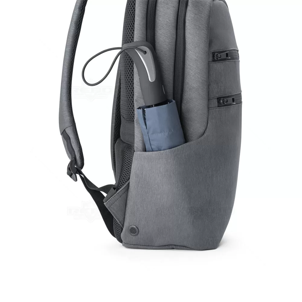 Mochila para notebook personalizada em Nylon impermeável com 2 compartimentos e alças almofadadas. O compartimento posterior tem 2 divisórias almofadadas com fecho em velcro para notebook até 17'' e tablet até 10.5''. Compartimento frontal com diversos bolsos interiores. Contém dois bolsos na parte frontal, tendo um deles bloqueio RFID. Nas laterais existe um bolso para garrafas em elastano e outro para o guarda chuva, com ilhós perfurados para evitar acumulação de água. A parte de trás almofadada tem bolso oculto e alça para transporte em trolley.