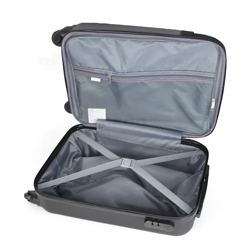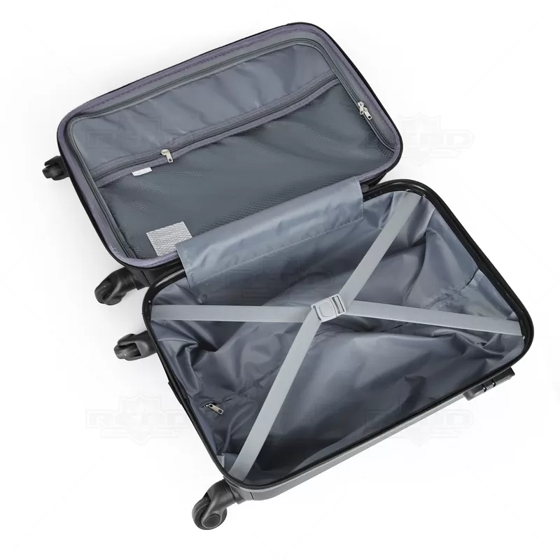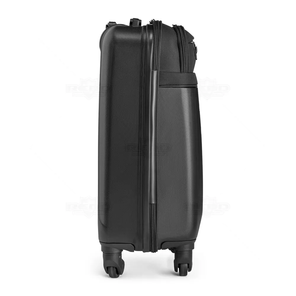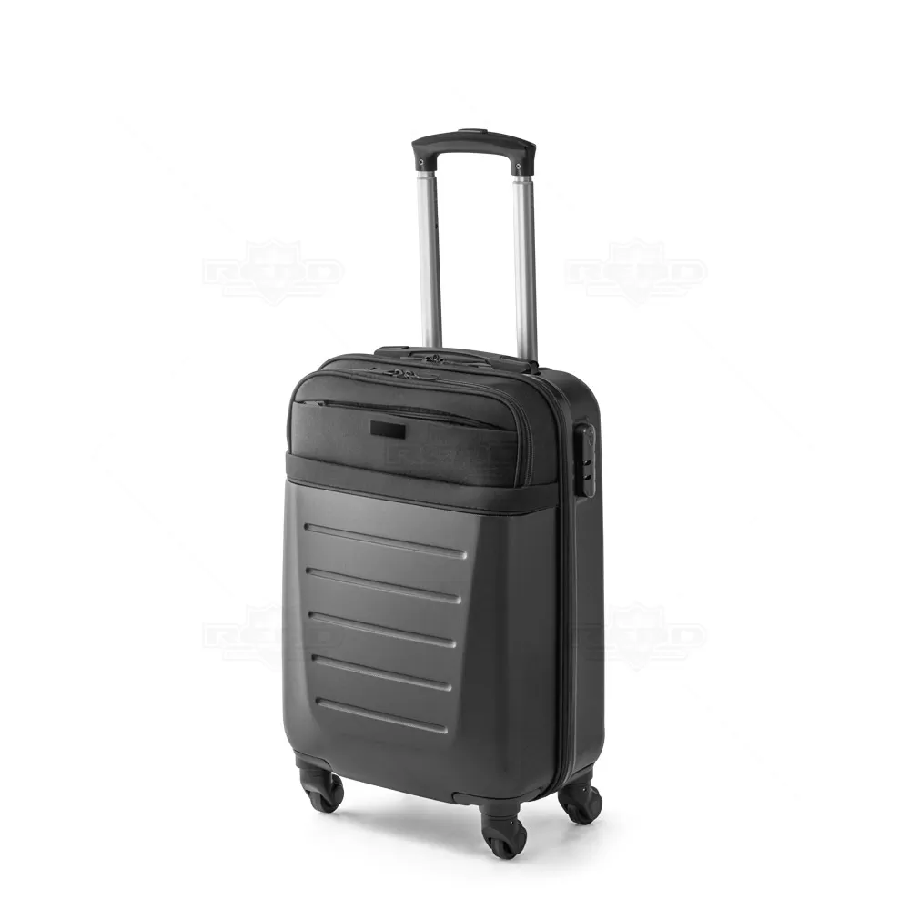 Mala de viagem personalizada modelo executivo em ABS e 600D com 4 rodas duplas giratórias, interior forrado e pega extensível em alumínio com altura até 460 mm. Compartimento almofadado para notebook até 15.6" e 2 bolsos frontais. Contém fecho de segurança com senha na lateral. Com placa preta de personalização. Capacidade até 33 L e peso de 1,67Kg. Imagem Ilustrativa.