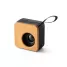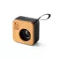 Caixa de som personalizada, produzida em ABS reciclado e bambu. Com potência de 3W, transmissão por Bluetooth 5.0 e função de rádio. Tempo de reprodução até 4h com uma bateria de 500 mAh. Imagem ilustrativa, itens decorativos não acompanham o produto. Ideal para brindes promocionais e eventos corporativos.