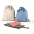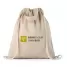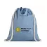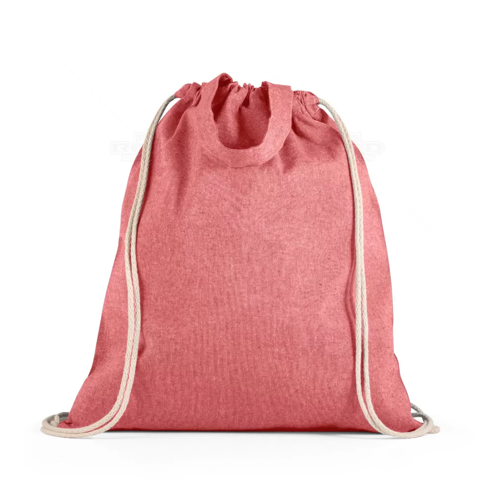 Sacola ecológica personalizada tipo mochila com algodão reciclado (140 g/m²), possui alças de mão com 30 cm e cordões em algodão para fechar.