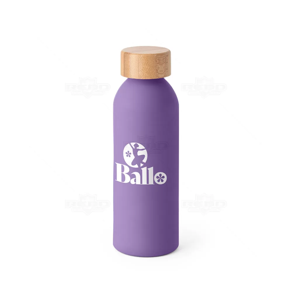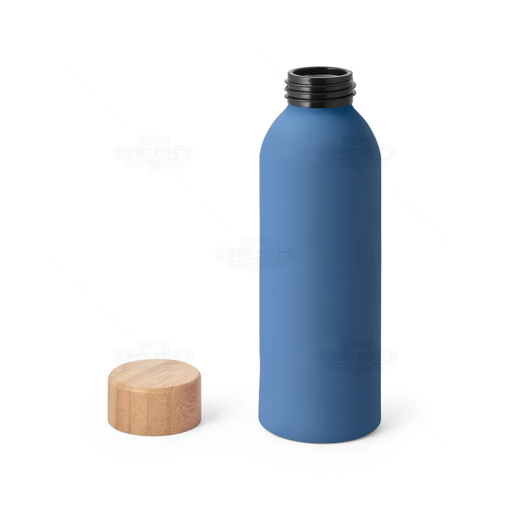 Squeeze personalizado produzido em alumínio com acabamento soft touch e tampa em bambu. Possui capacidade de 550 ml. Ideal para brindes promocionais e eventos corporativos.