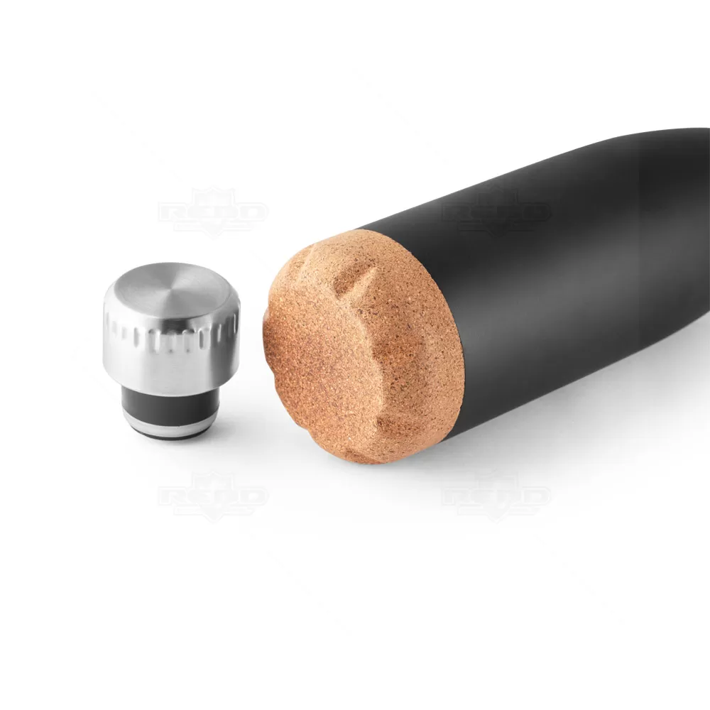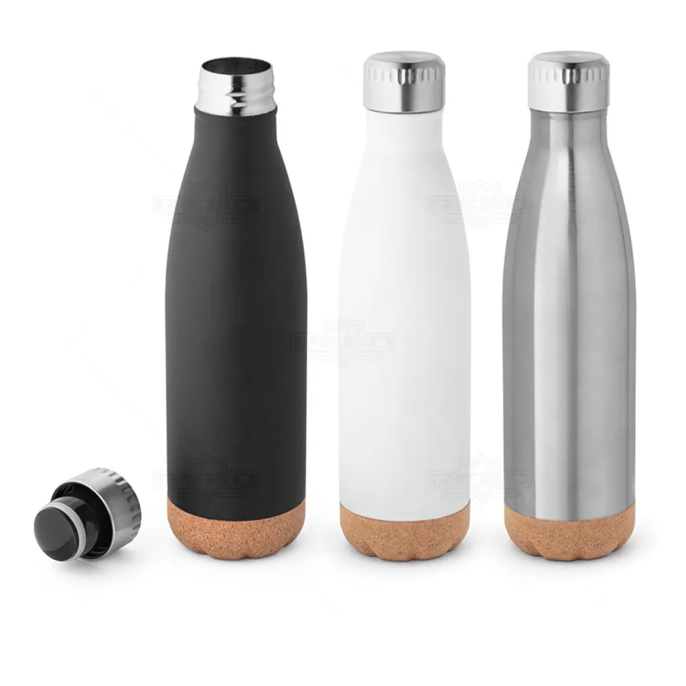 Squeeze térmico personalizado, produzido em aço inox e base em cortiça, parede dupla com isolamento a vácuo e com capacidade de 560ml. Conta com tampa rosqueável e anel de vedação que impede o vazamento do líquido. Mantém as bebidas quentes ou frias por mais tempo. Ideal para uso em escritório, academia, brindes personalizados e eventos corporativos.