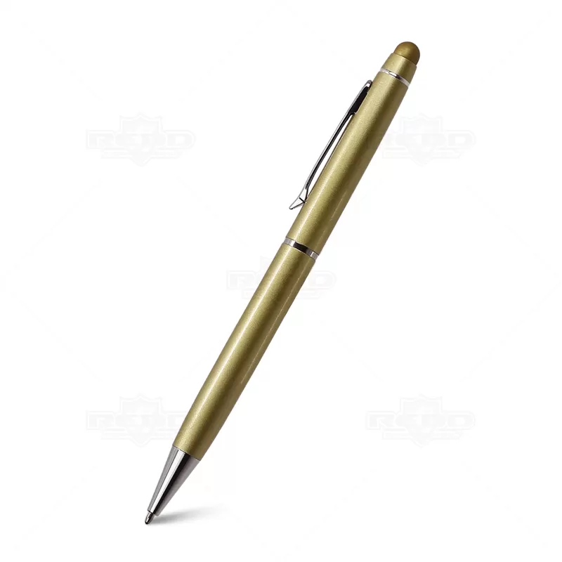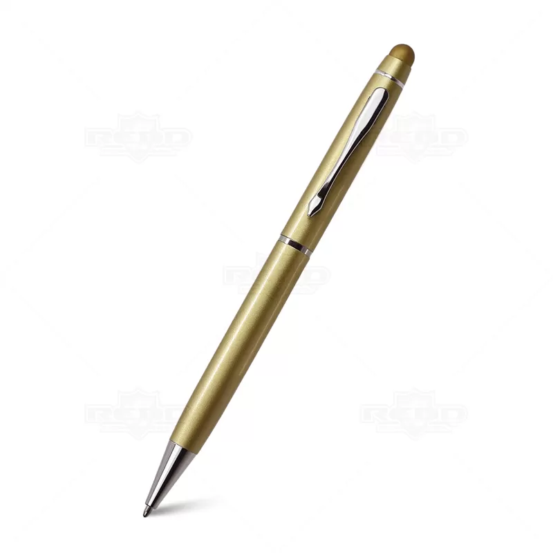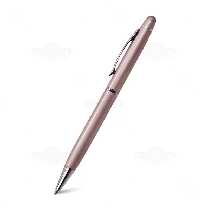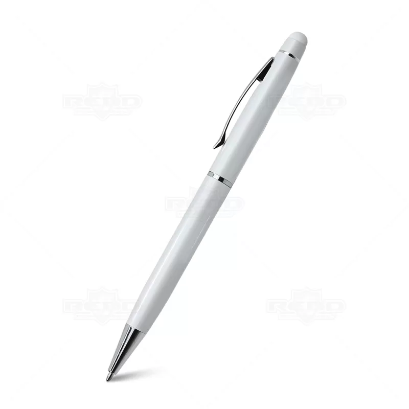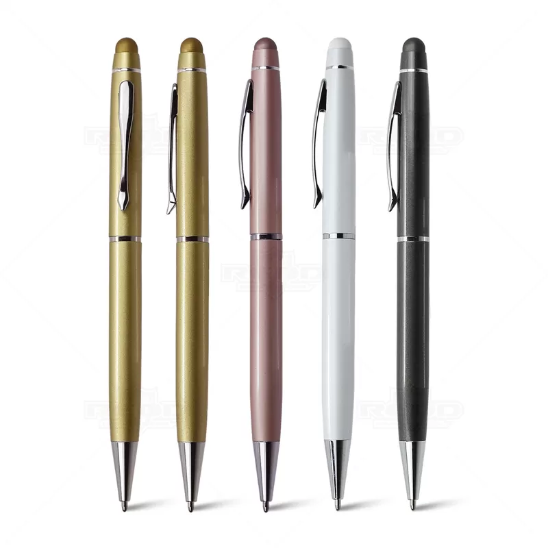 Caneta de metal personalizada, com ponteira touch para uso em tablets, smartphones e aparelhos touch screen, clip e anel cromados e esferográfica na cor azul, com acionamento por giro. Imagem ilustrativa, itens decorativos não acompanham o produto. Ideal para brindes promocionais e eventos corporativos.