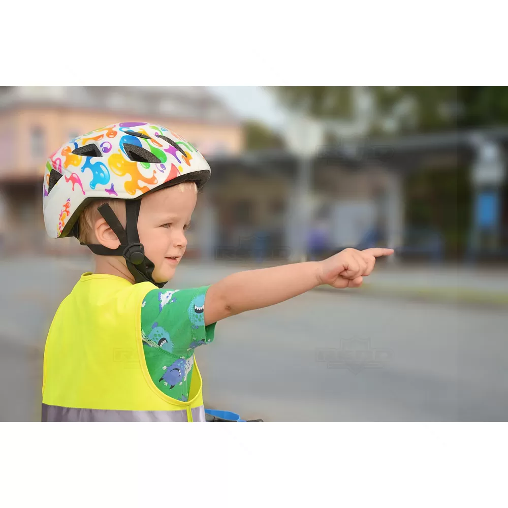 Colete refletivo infantil, em poliéster de cor fluorescente, resistente ao desgaste, forte resistência à corrosão, fácil de limpar e secar para atender às necessidades do usuário. Altamente refletivo à noite e altamente visível durante o dia. Contém 2 faixas retrorrefletivas horizontais, com elástico na lateral e é certificado pela norma EN 17353. Produto não destinado para uso profissional. Imagem ilustrativa.