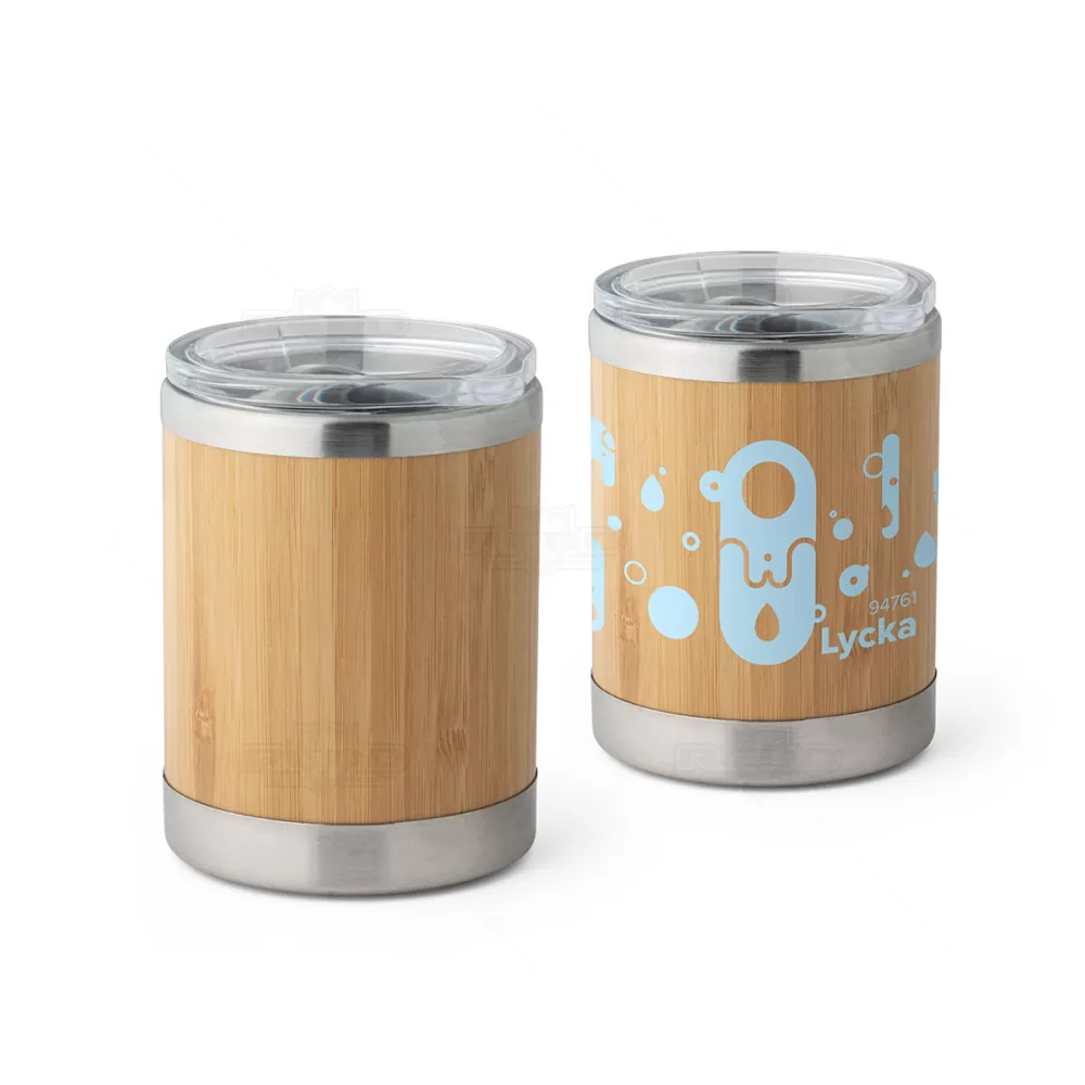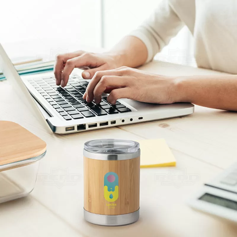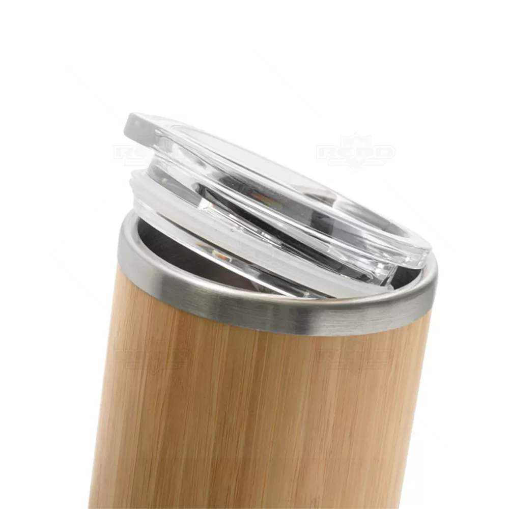 Copo térmico personalizado, produzido em aço inox de parede dupla isolada a ar com revestimento externo em bambu, tampa com abertura deslizante, facilitando o consumo da sua bebida. *Imagem ilustrativa, itens não acompanham o produto. Ideal para brindes personalizados e eventos corporativos.