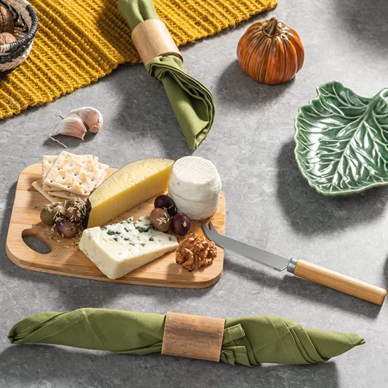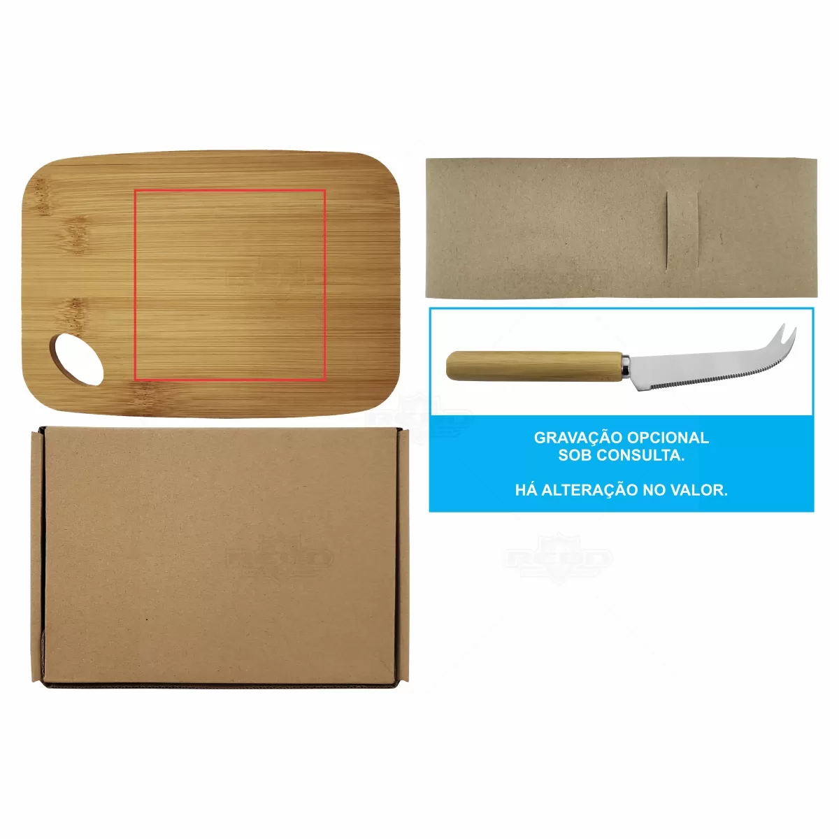 Kit queijo personalizado, constituído por 1 tábua de corte em bambu e 1 pequena faca de queijo. Durável e higiênico, o bambu é um material resistente e com propriedades que evitam a proliferação de bactérias. *Imagem ilustrativa, itens não acompanham o produto. Ideal para brindes promocionais e eventos corporativos.