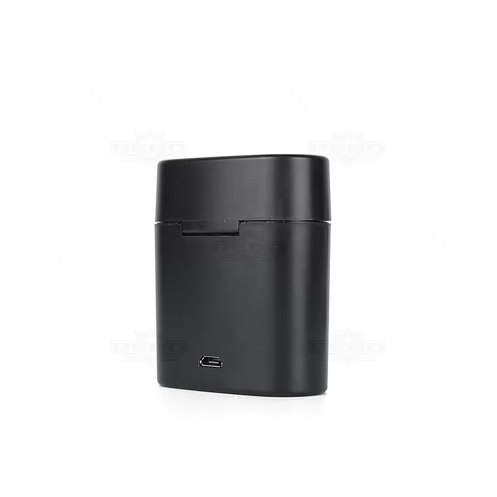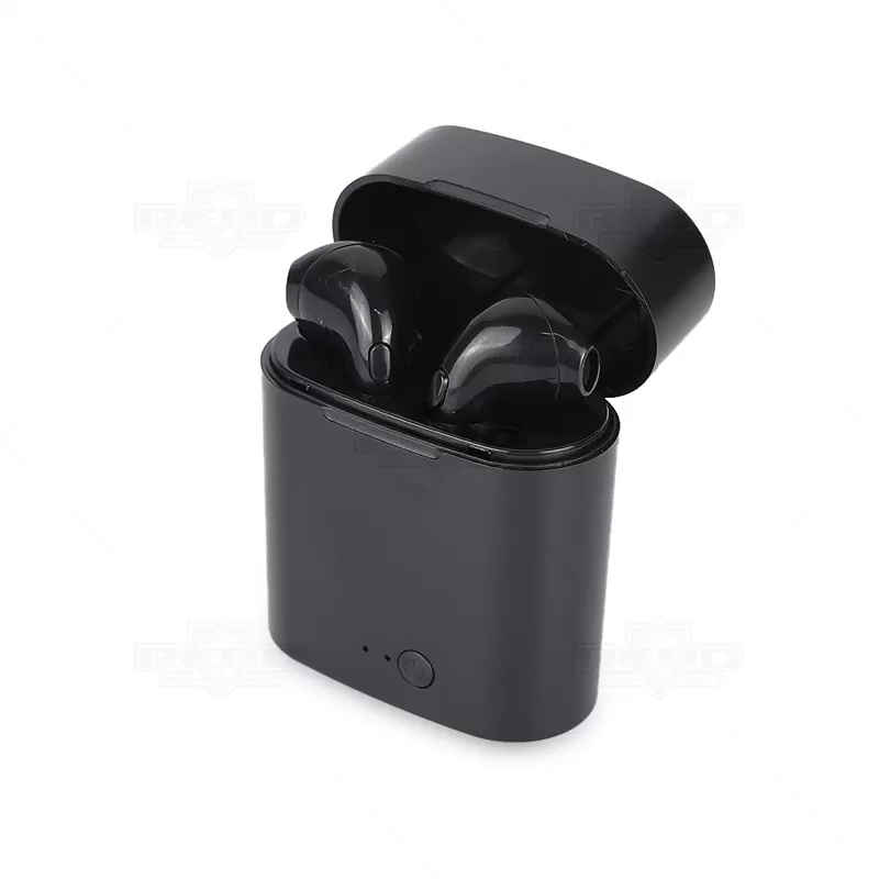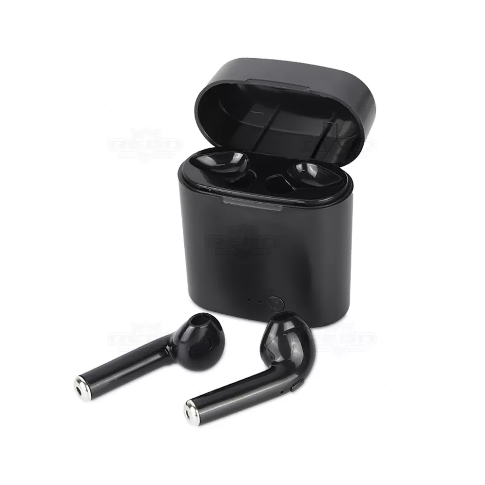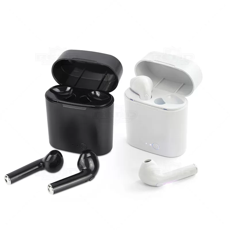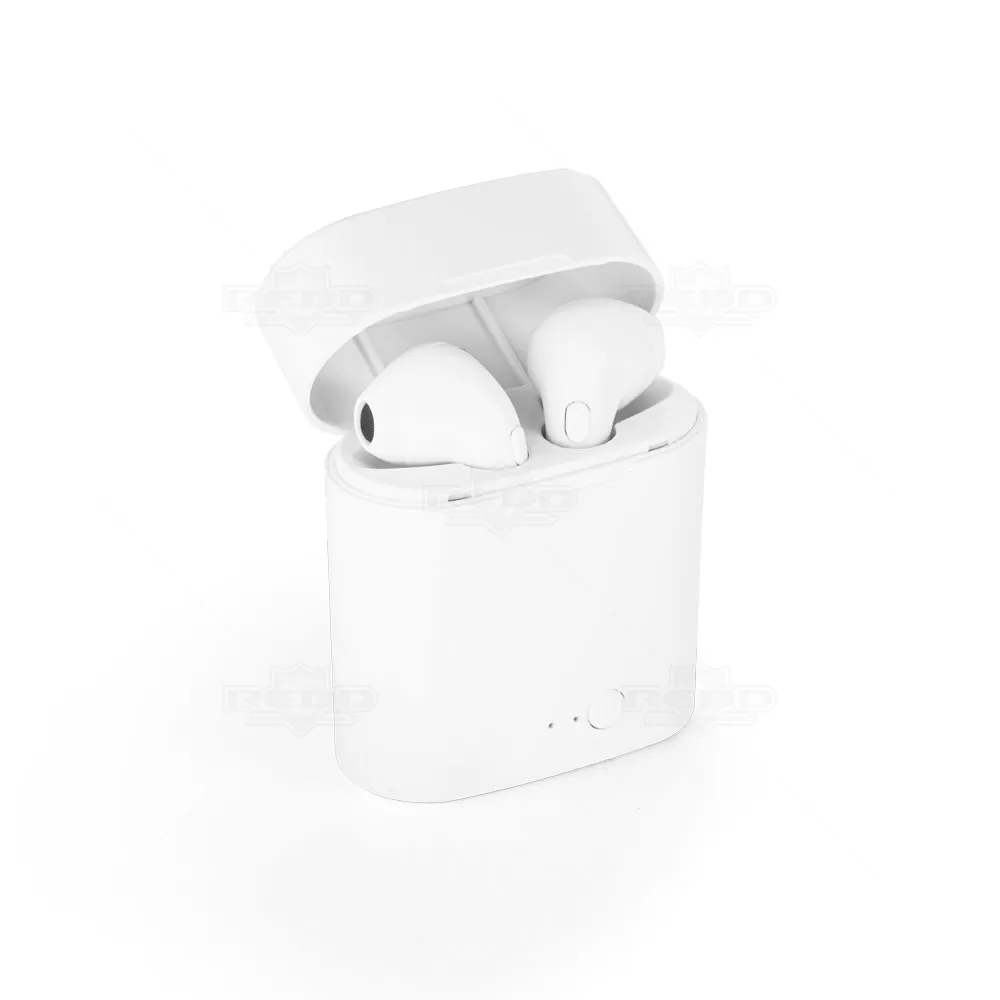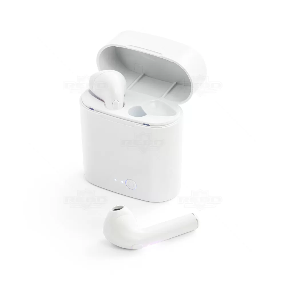 Fone de ouvido bluetooth personalizado produzido em ABS, possui microfone, caixa de carregamento de 250mah. Transmissão sem fio 5.1, autonomia até 01h30, frequência 20Hz-20KHz e 98 dB. Cada fone tem um botão multifunções e a caixa tem uma porta micro USB para ser carregada através do cabo (acompanha). Imagem ilustrativa.