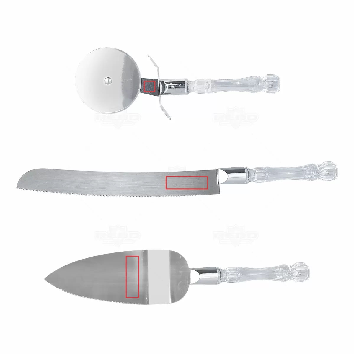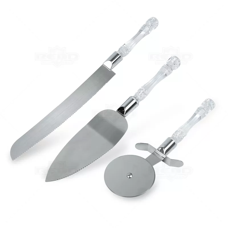 Kit pizza personalizado de cozinha com 3 peças, composto por cortador de pizza, espátula e faca em inox com cabos plásticos. Perfeito para trazer requinte ao momento de descontração entre seus convidados enquanto serve aquele lanche gostoso e aquela pizza deliciosa!!!