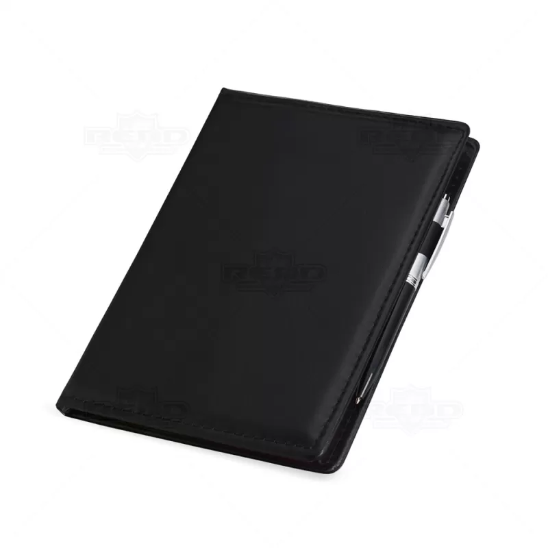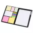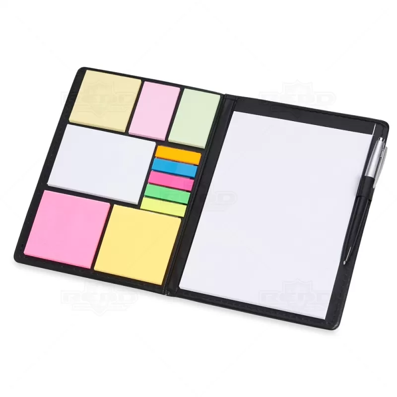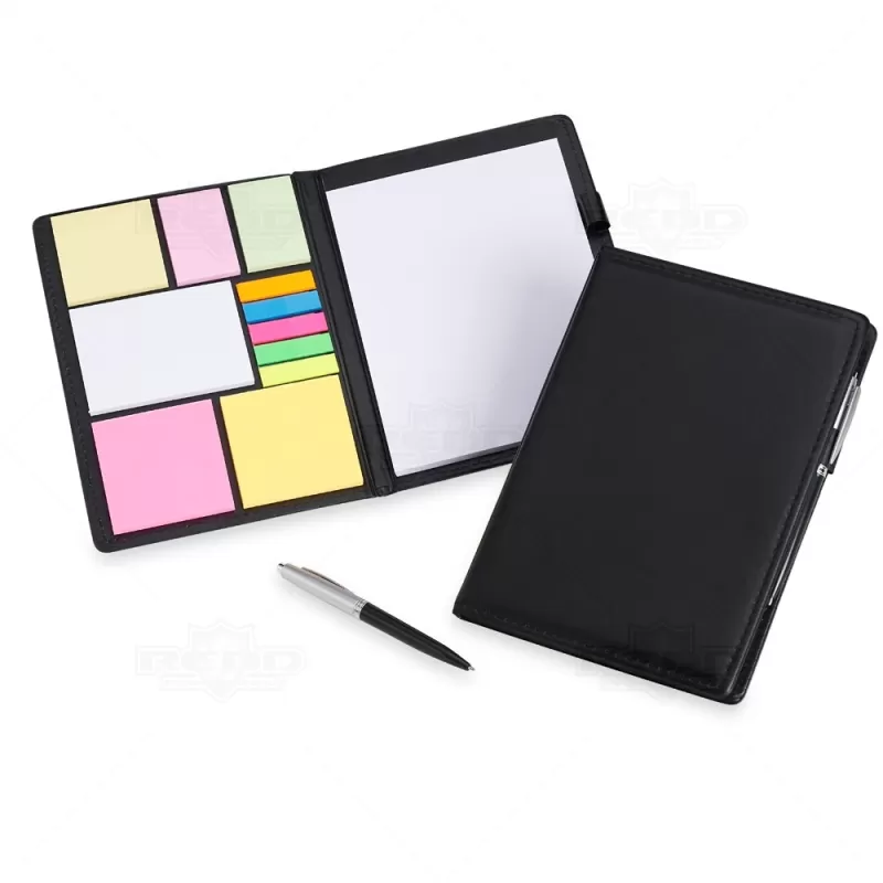 Conjunto para anotações em couro sintético com autoadesivos e caneta plástica. Contém seis blocos de tamanhos e cores diversos com aproximadamente 50 folhas cada, conjunto de cinco marcadores coloridos plásticos autoadesivos com aproximadamente 26 folhas cada e bloco A5 com aproximadamente 50 folhas branco sem pauta e caneta esferográfica com carga azul e acionamento por clique.