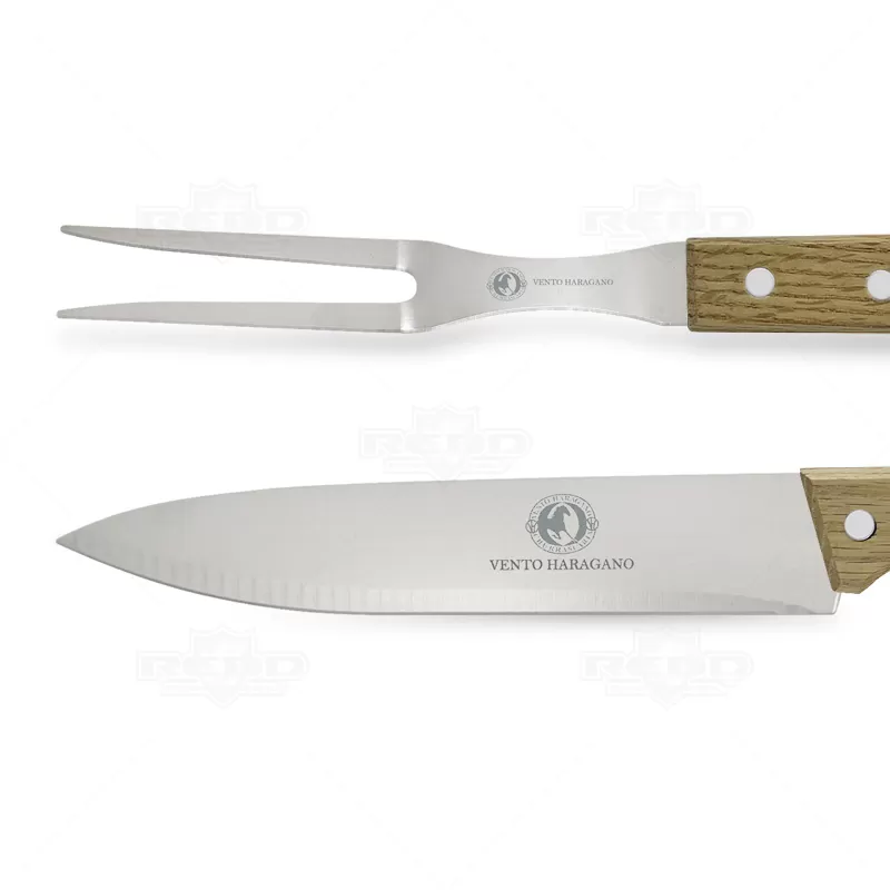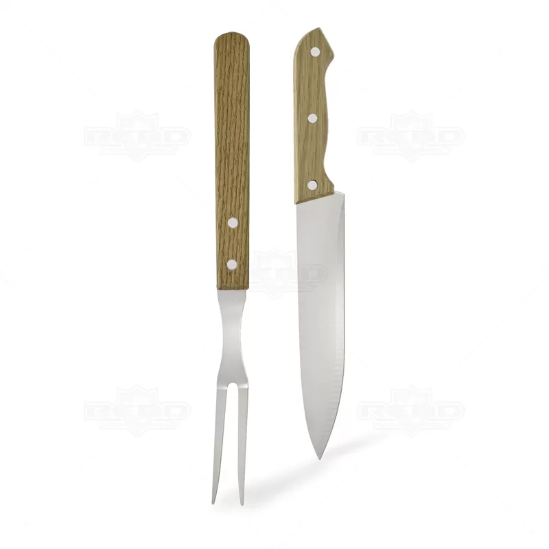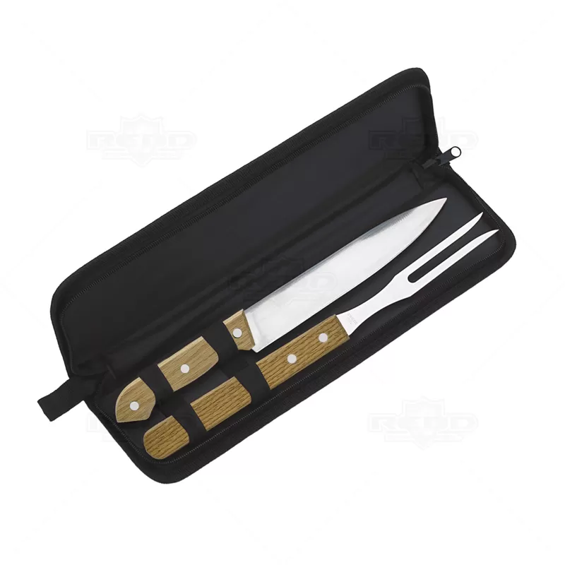 Kit churrasco personalizado com 2 peças e estojo em nylon. Possui 1 Garfo trinchante: 33,5 x 5,4 cm com cabo de Madeira, 1 Faca: 33,0 x 4,2 cm e 1 estojo em nylon com alça de mão e fechamento por zíper. Ideal para brindes promocionais e eventos corporativos. Obs: A matéria prima do produto poderá sofrer alteração na tonalidade da madeira.