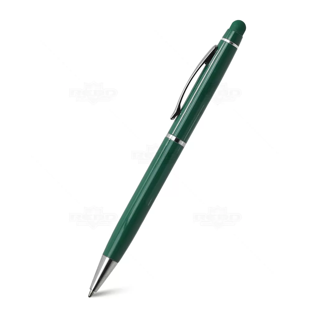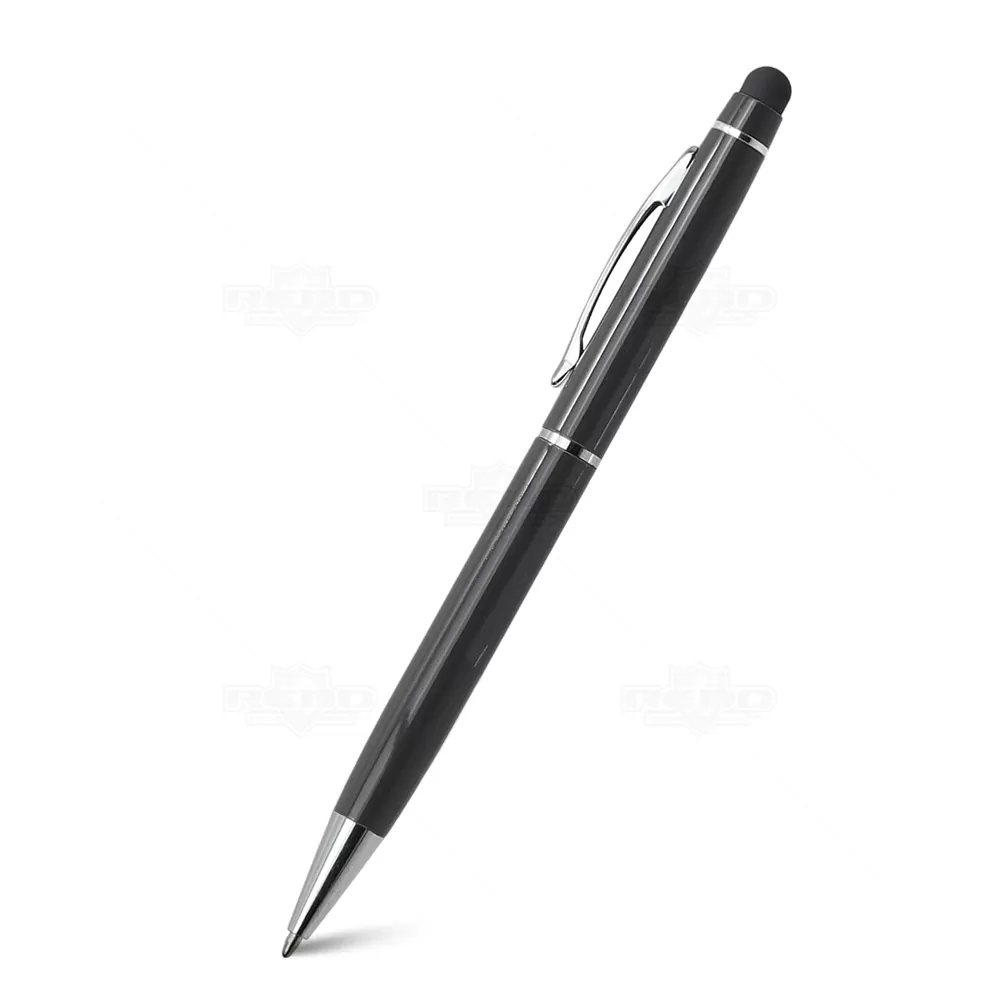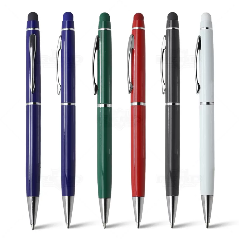 Caneta de metal personalizada, com ponteira touch para uso em tablets, smartphones e aparelhos com touch screen, clip e anel cromados, esferográfica na cor azul com acionamento por giro. Ideal para brindes promocionais e eventos corporativos. Imagem ilustrativa smartphone não acompanha o produto.