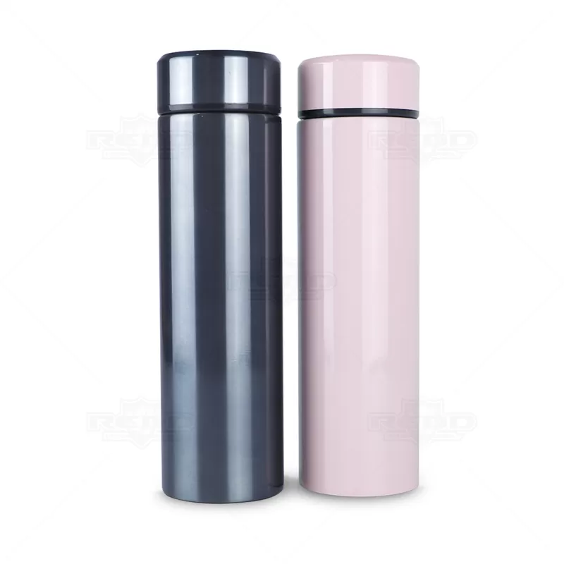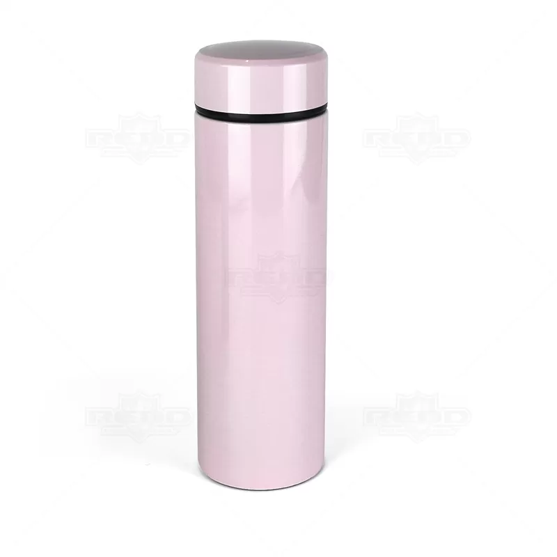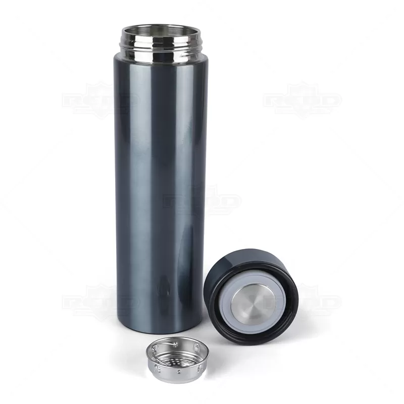 Garrafa térmica personalizada com capacidade para 500ml produzida em aço inoxidável com revestimento brilhante e infusor para chás. Possui anel de silicone para evitar vazamentos e paredes duplas com isolamento a vácuo para manter a temperatura da bebida. Conserva o líquido quente por até 12 horas e frio até 18 horas. Ótima para academias, práticas esportivas, brindes promocionais e eventos corporativos.