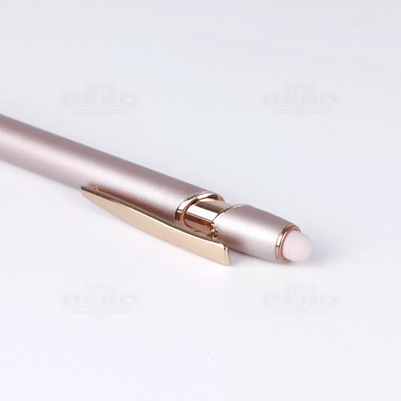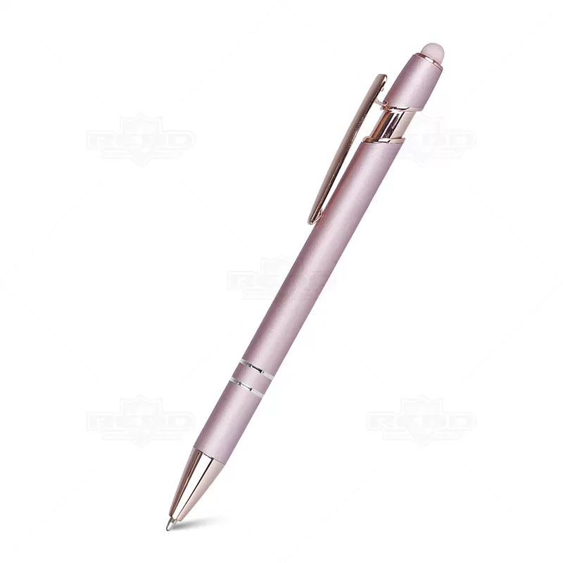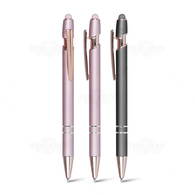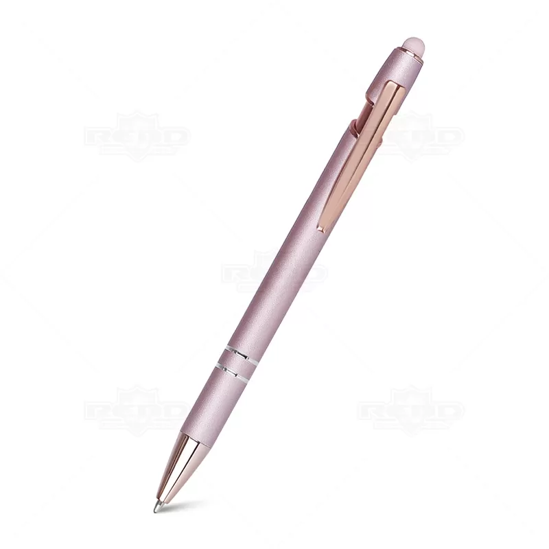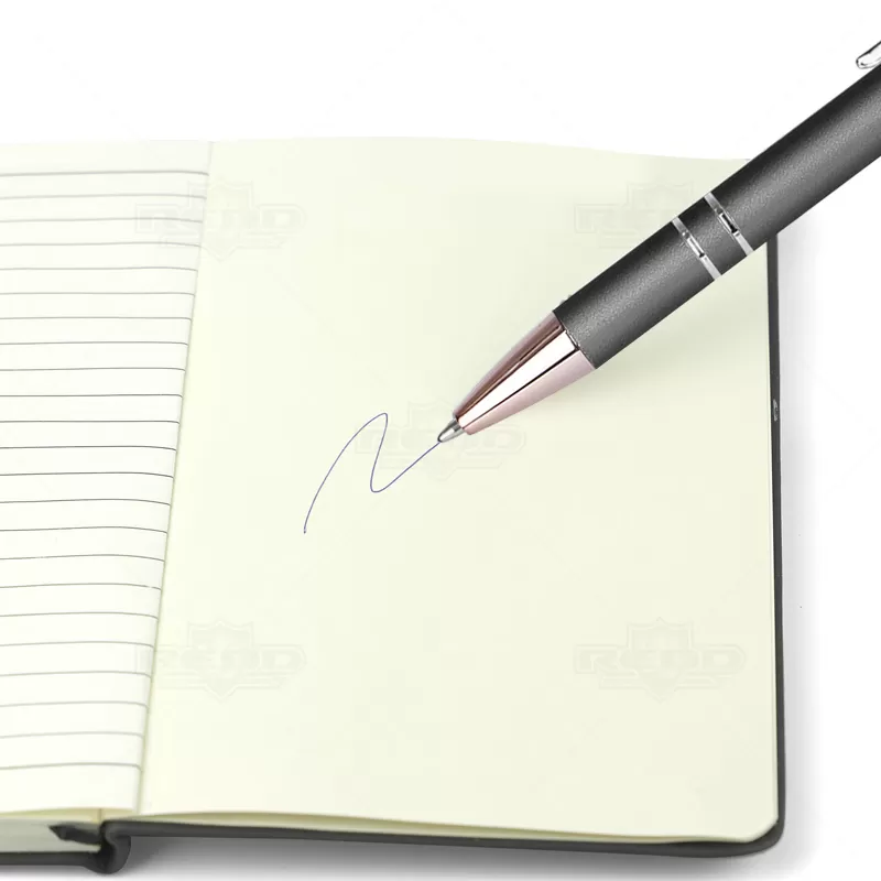 Caneta de metal personalizada, clip e a extremidade acobreados, dando mais elegância ao produto, ponteira touch para uso em tablets, smartphones e telas touch screen, possui acionamento por click com escrita esferográfica na cor azul e acabamento em textura fosca. Ideal para brindes promocionais e eventos corporativos. *Imagem ilustrativa, bloco não acompanha o produto.