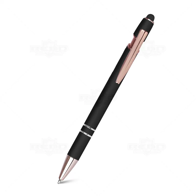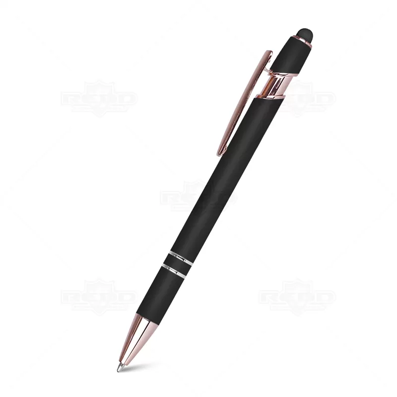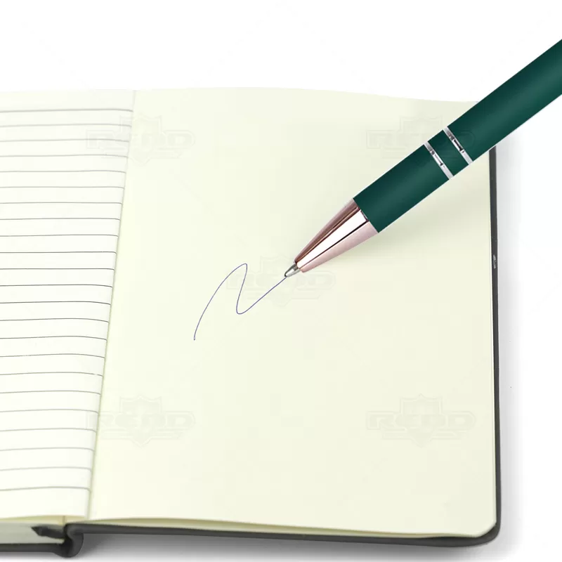 Caneta de metal personalizada, conta com clip e a extremidade acobreados dando mais elegância, ponteira touch para uso em tablets, smartphones e telas touch screen, possui acionamento por click com escrita esferográfica na cor azul e acabamento soft touch de diversas cores. Ideal para brindes promocionais e eventos corporativos. *Imagem ilustrativa, bloco não acompanha o produto.