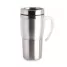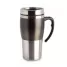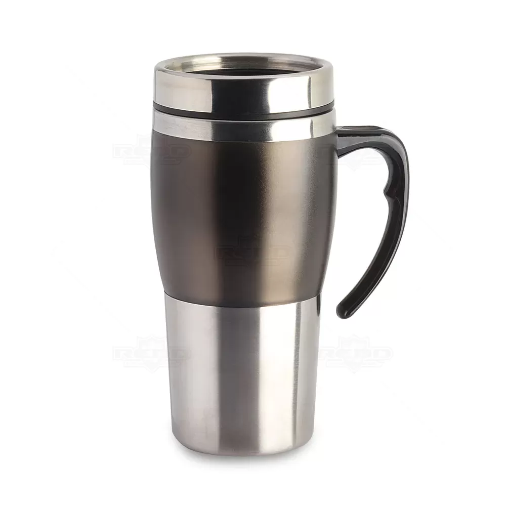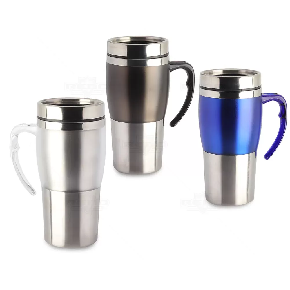 Caneca em aço inox com detalhe plástico colorido, alça na cor do detalhe, corpo escovado, tampa feita em plástico atóxico com sistema "abre/fecha" para que não haja necessidade de abrir totalmente e facilitar o consumo da sua bebida preferida. Ideal para brindes personalizados e eventos corporativos.