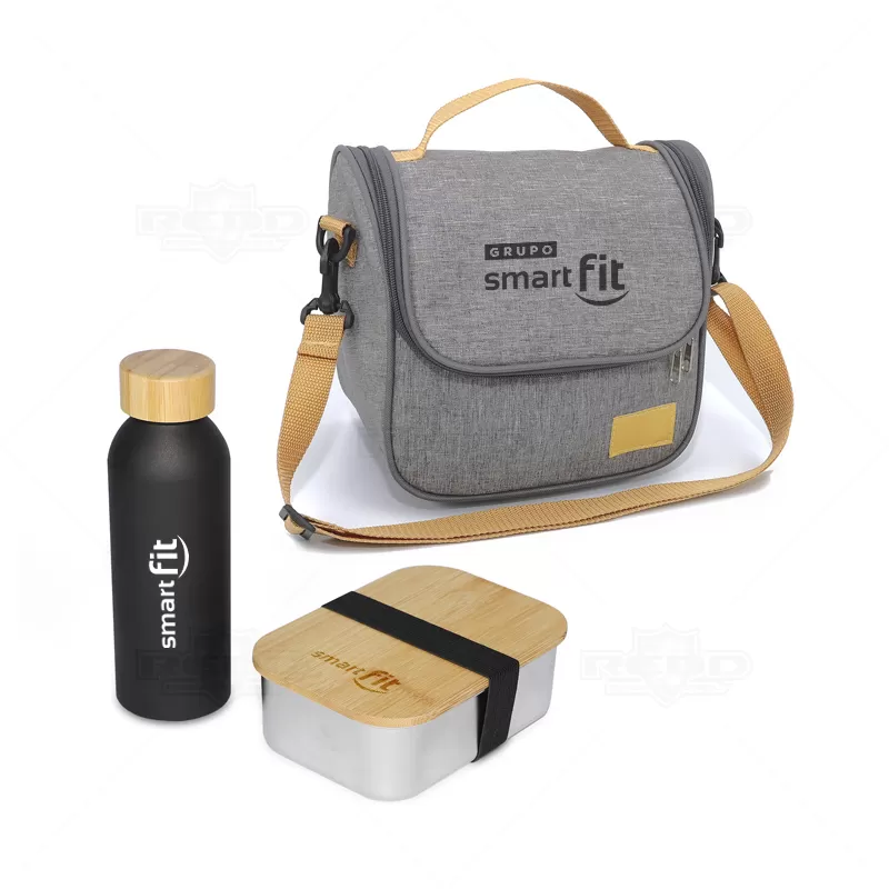 Kit Integração Onboarding Personalizado composto por 1 squeeze de inox (SQ195), uma marmita de metal (MT18) colocados perfeitamente em uma bolsa térmica de extrema elegância (BT61). Ideal para recepcionar seus novos parceiros e colaboradores.