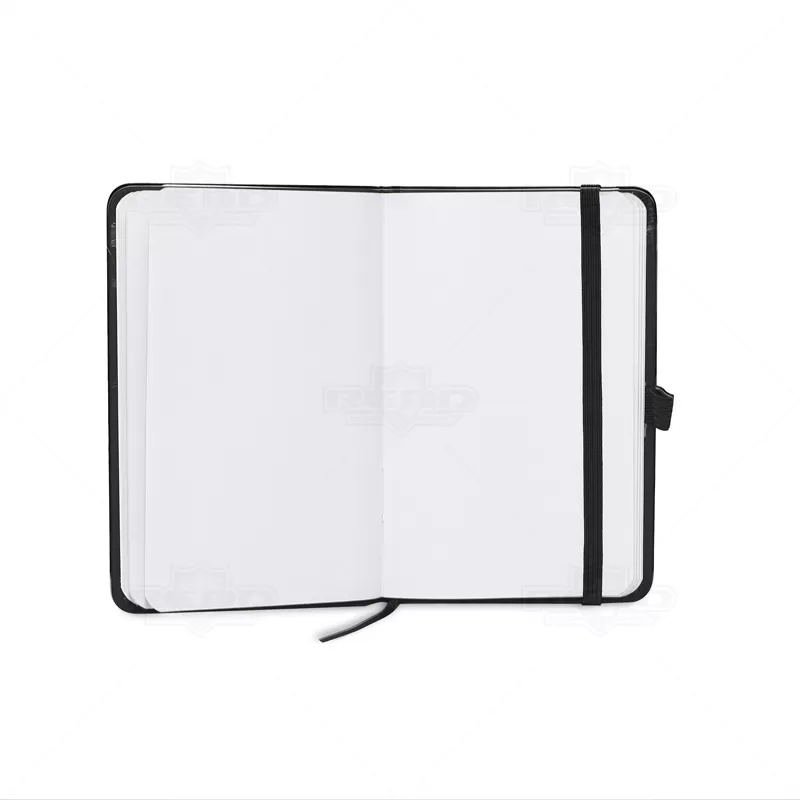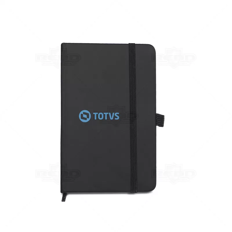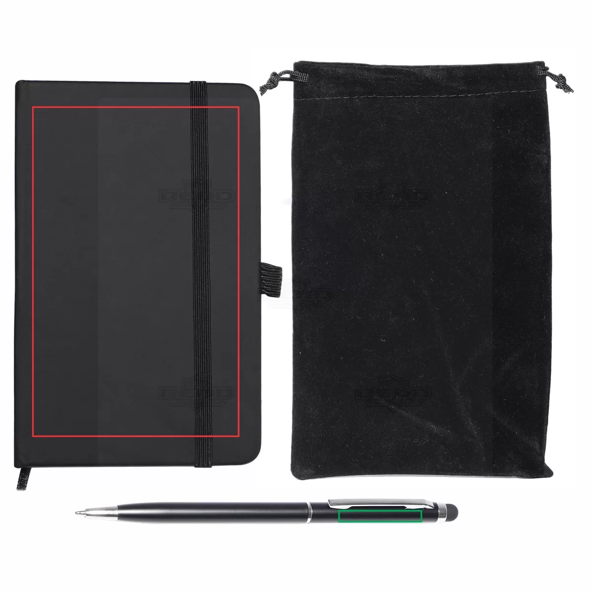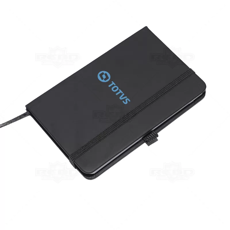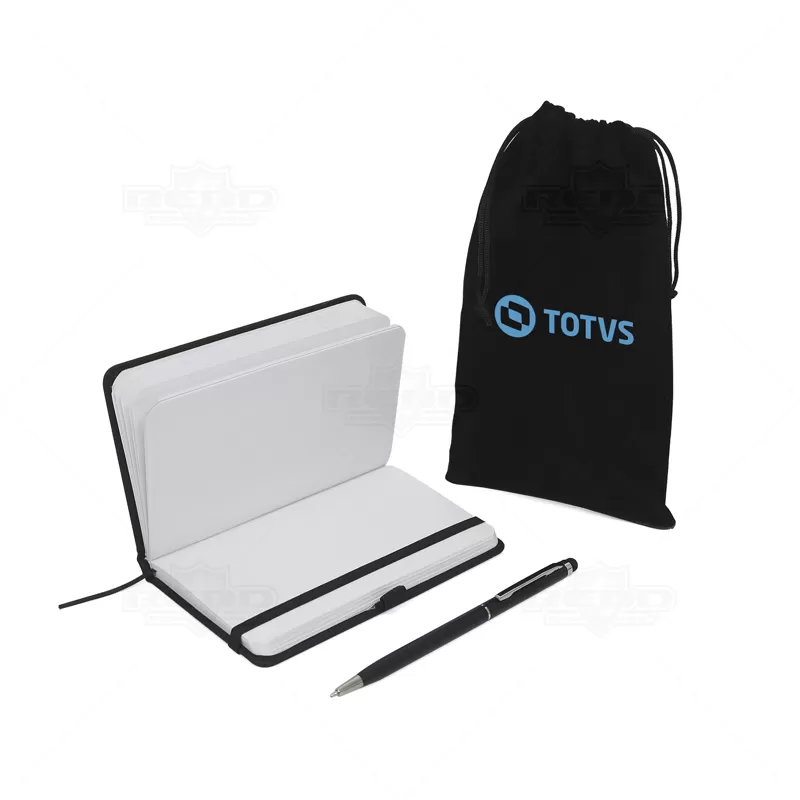 Bloco de anotações com caneta esferográfica personalizado. Possui 1 caneta esferográfica com escrita azul, bloco de anotações em material sintético com 80 folhas não pautadas brancas, marca páginas e elástico para fechamento e estojo de veludo com cordão para fechamento. Ótima opção para eventos corporativos, campanhas publicitárias e brindes promocionais.