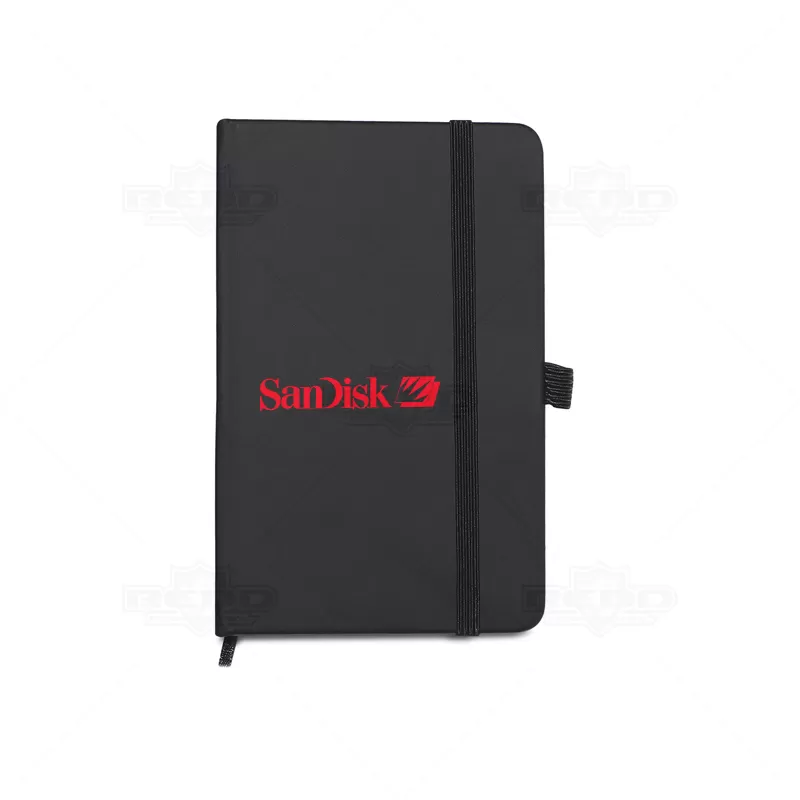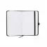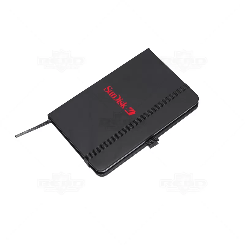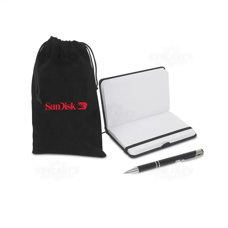 Bloco de anotações com caneta esferográfica personalizado. Possui 1 caneta esferográfica com escrita azul, bloco de anotações em material sintético com 80 folhas não pautadas brancas, marca páginas e elástico para fechamento e estojo de veludo com cordão para fechamento. Ótima opção para eventos corporativos, campanhas publicitárias e brindes promocionais.