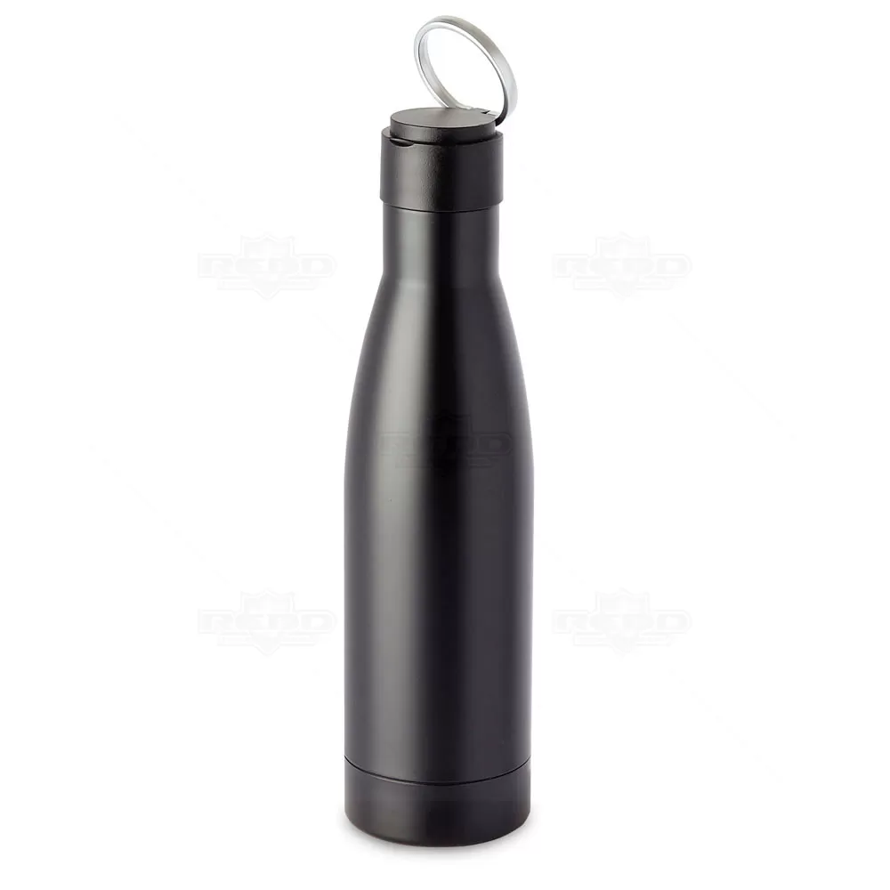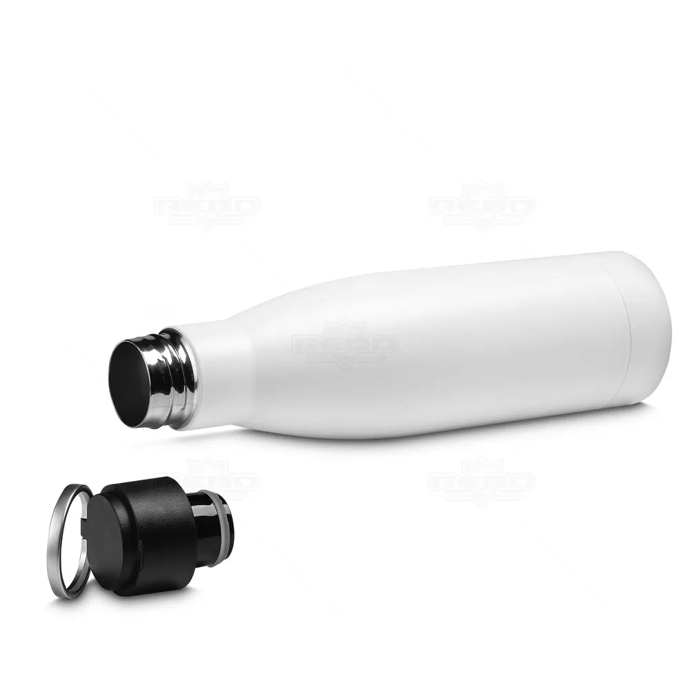 Squeeze personalizado produzido em aço inox com capacidade de 500ml. Possui paredes duplas e tampa de plástico rosqueável, conta ainda com alça de transporte em aço inoxidável. Ideal para brindes personalizados, escritório, academia e evento corporativos.
