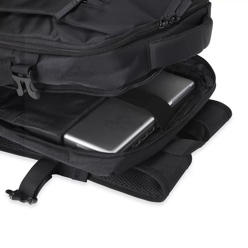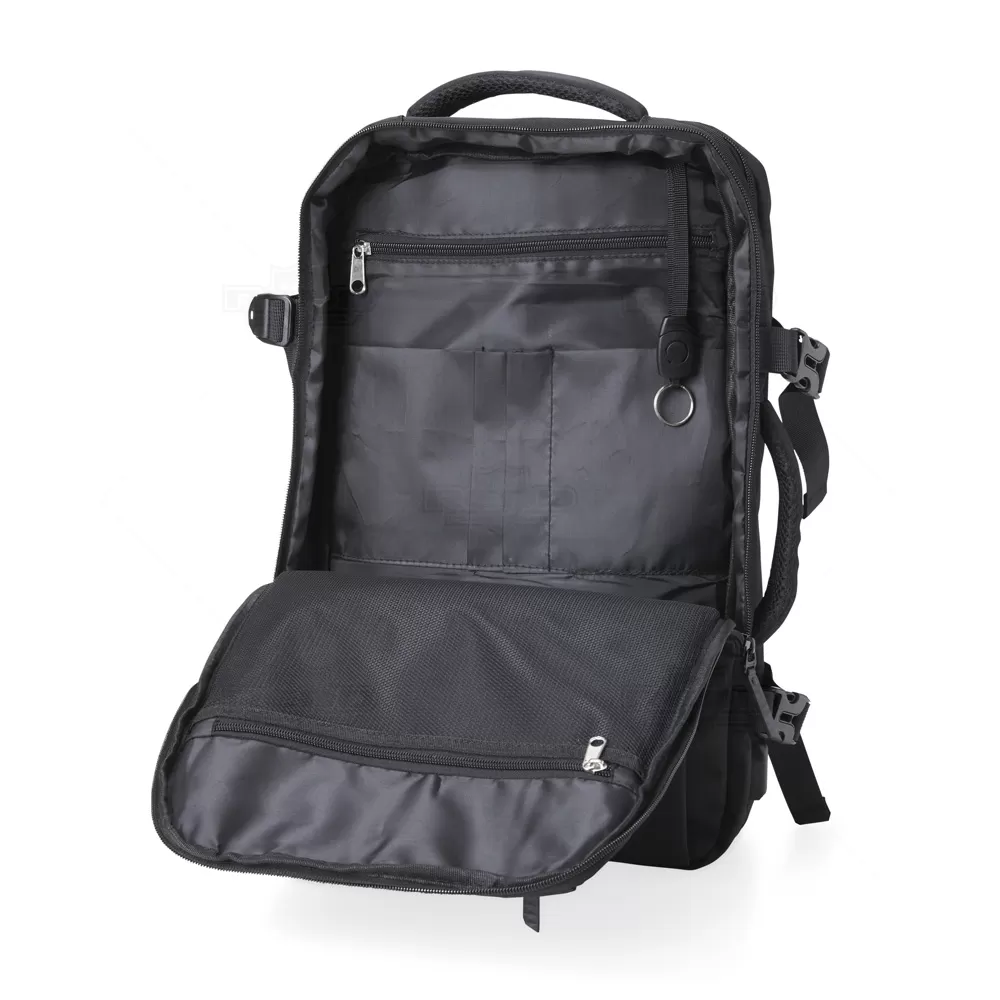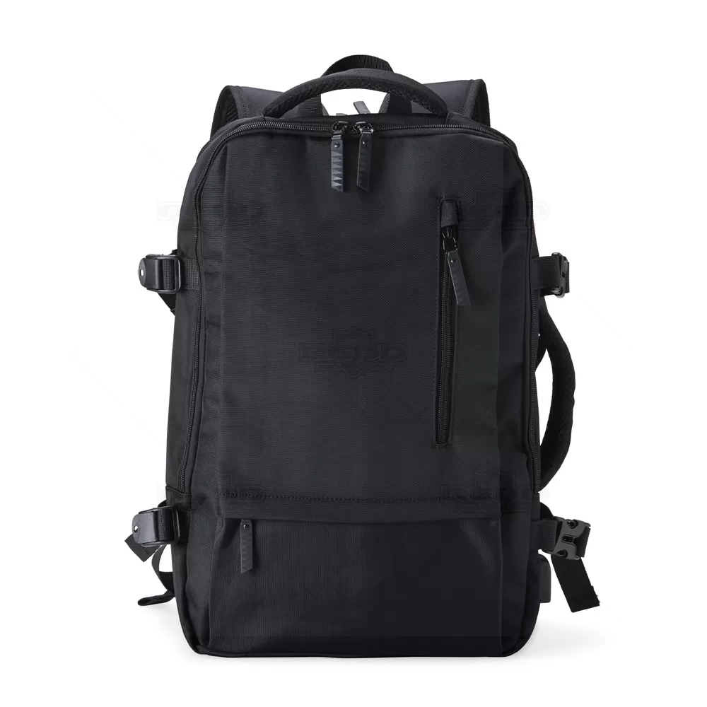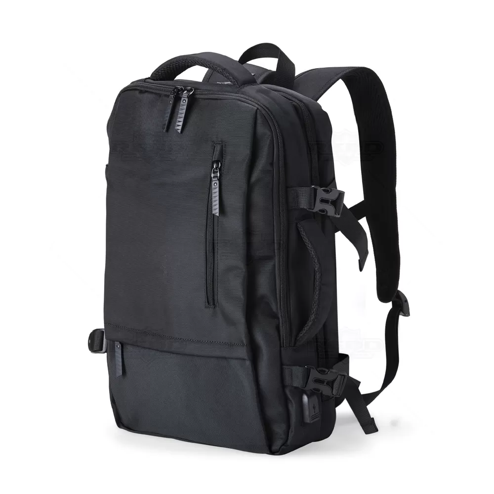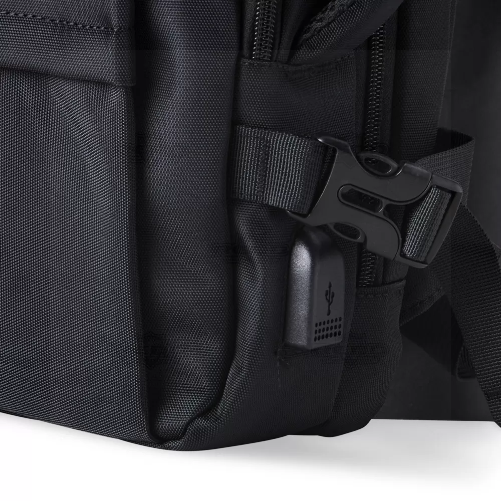 A mochila para notebook é produzida em nylon de alta qualidade, oferecendo durabilidade e resistência. Possui dois compartimentos principais totalmente forrados e acolchoados, proporcionando proteção para seu notebook de até 15,6", além de espaço para carteira, celular, canetas, documentos e outros itens essenciais. Inclui também um porta-chaves de fácil acesso, dois bolsos frontais, tira de transporte para trolley e entrada USB para maior conveniência. A parte posterior e as alças são almofadadas para garantir conforto no uso. Com duas alças, uma superior e uma lateral, permite diversas opções de transporte. Ideal para brindes promocionais e eventos corporativos, esta mochila combina funcionalidade e estilo. *Imagem ilustrativa, itens internos não acompanham o produto.
