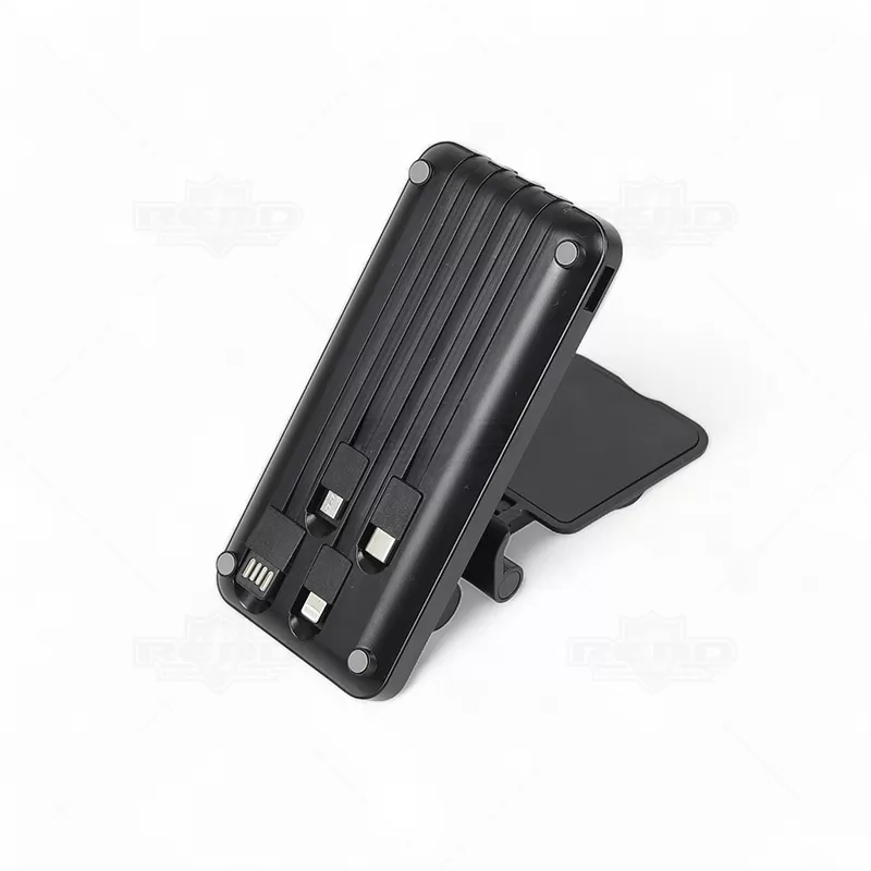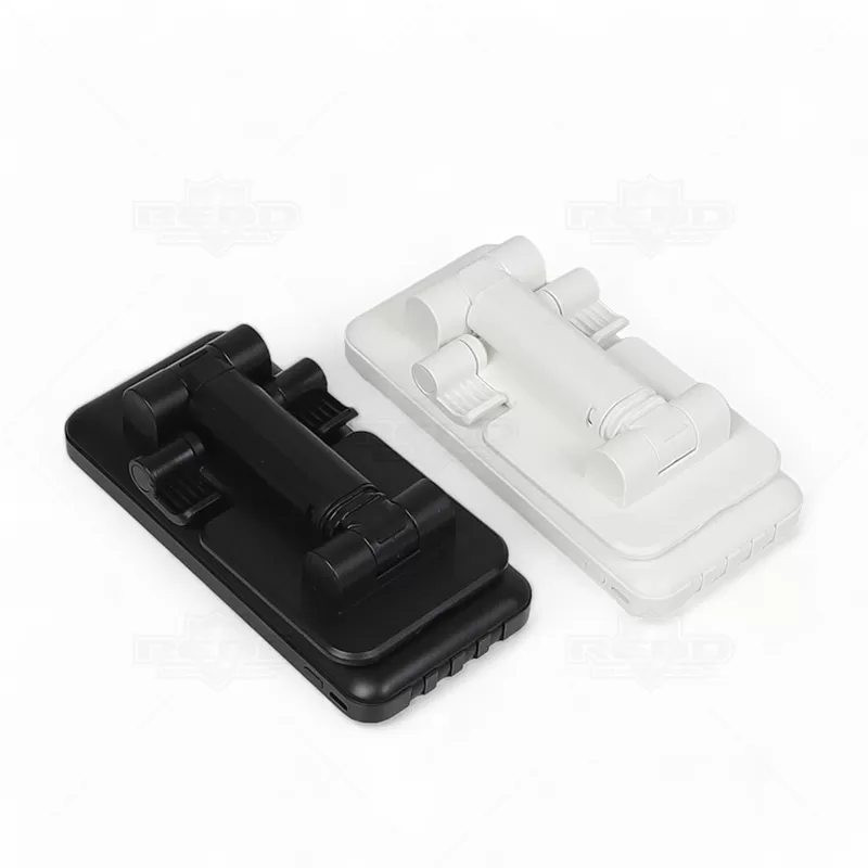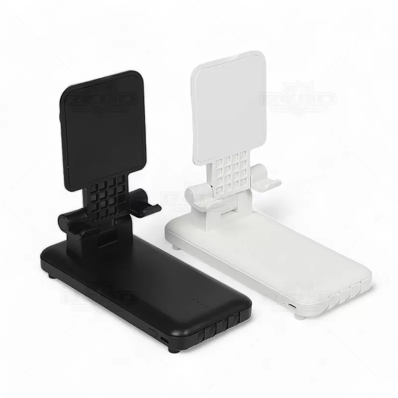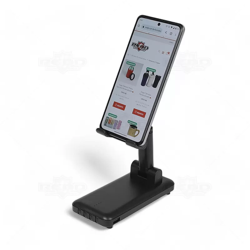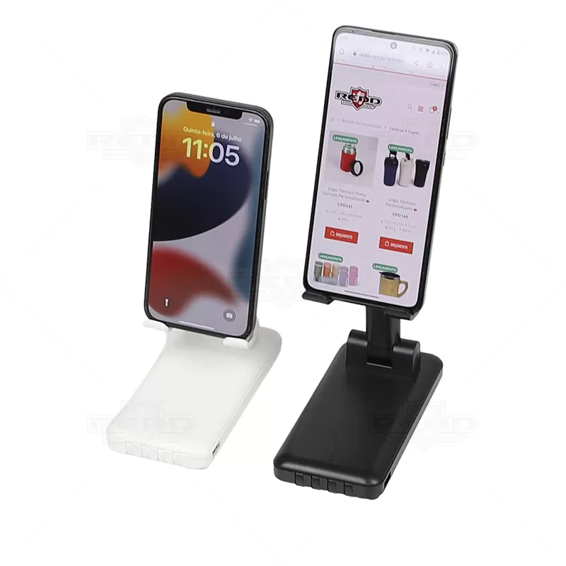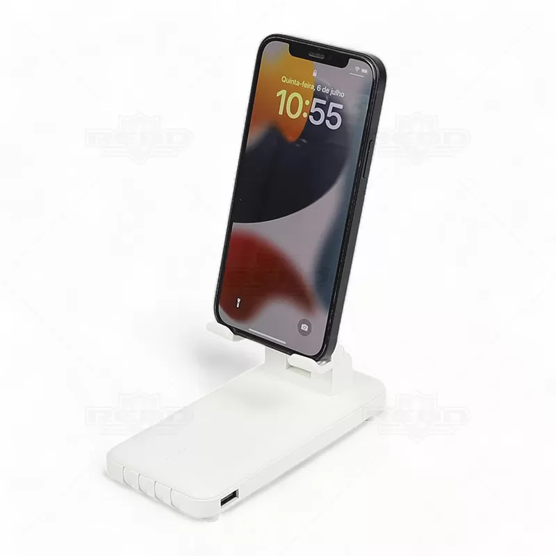 Carregador personalizado portátil com uma base de carregamento em que permite simultaneamente ser usada como um carregador e um porta celular com regulagem de altura e ângulo e tendo ainda a base antiderrapante. É um objeto de design arrojado e dadas as suas características técnicas pode ser usado em viagens (como bateria portátil). Bateria com indicador de carga LED, possibilita o carregamento de até 2 dispositivos em simultâneo, com entrada micro USB e saídas tipo-C, lightning, V8 e micro USB. Capacidade de 10.000 mAh. Fornecida em caixa presente com cabo incluso. Tendo a parte externa confeccionada em plástico resistente, podendo personalizar com o seu logo e trazer destaque a sua empresa. O carregador ideal para brindes corporativos e eventos promocionais.
