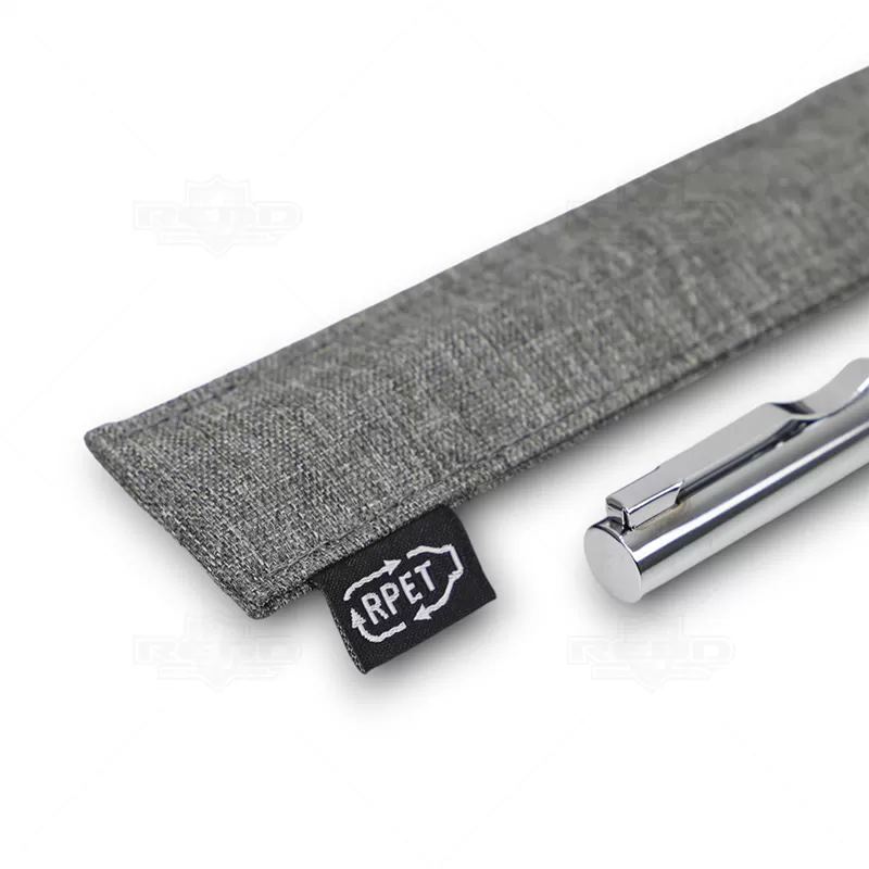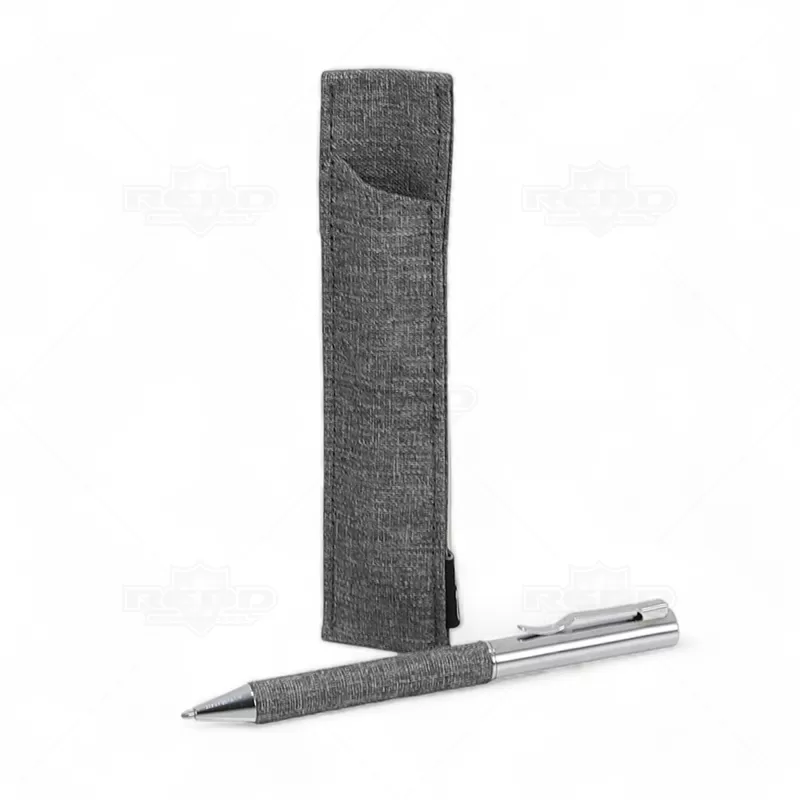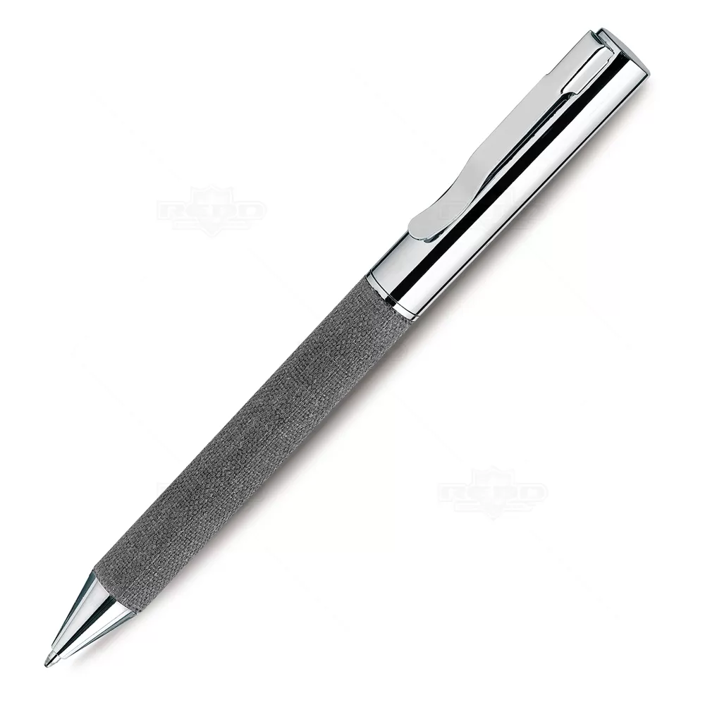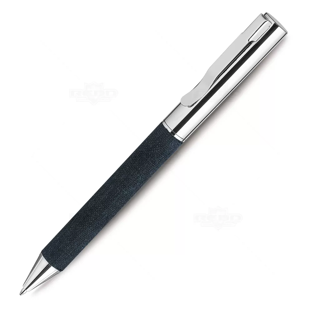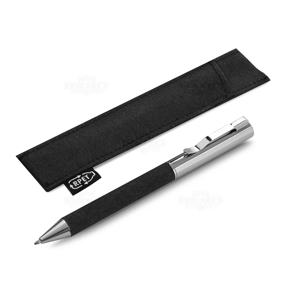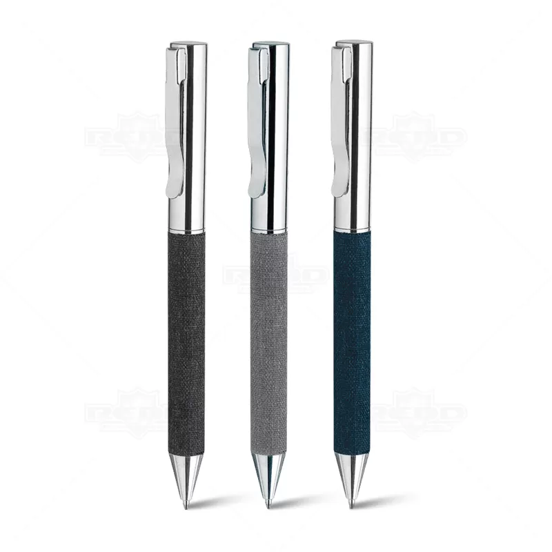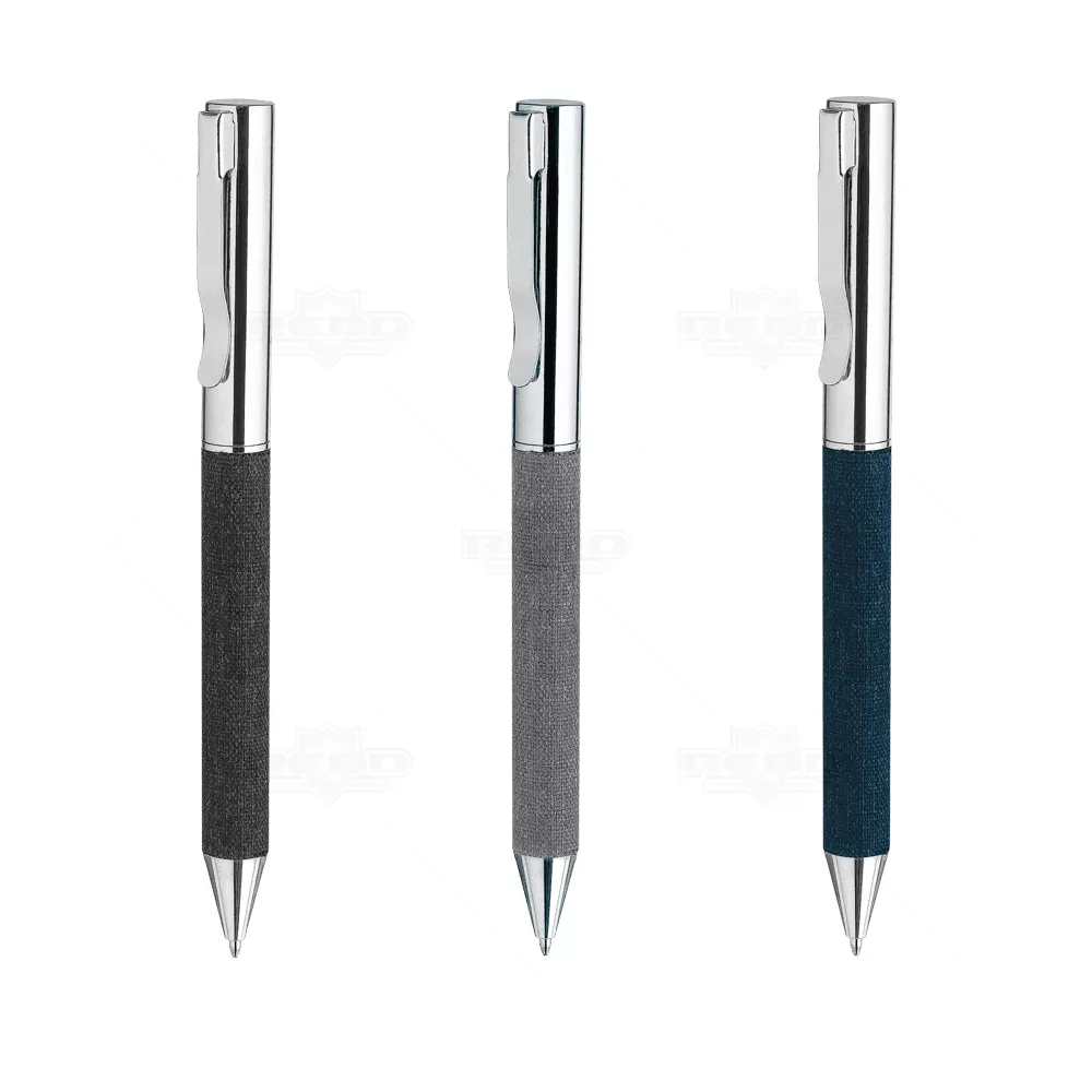 Caneta de metal personalizada, destacando-se pelo detalhe em tecido e acabamento em metal. Equipada com acionamento por mecanismo giratório e esferográfica na cor preta, esta caneta inclui uma embalagem em material reciclável que complementa o tom do detalhe. Ideal para promover sua empresa em eventos corporativos, brindes personalizados e campanhas promocionais. Com seu design elegante e funcionalidade superior, é perfeita para transmitir uma imagem de sofisticação e sustentabilidade. Uma escolha ideal para quem valoriza qualidade e estilo em cada detalhe.
