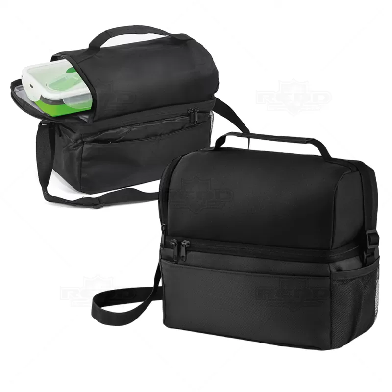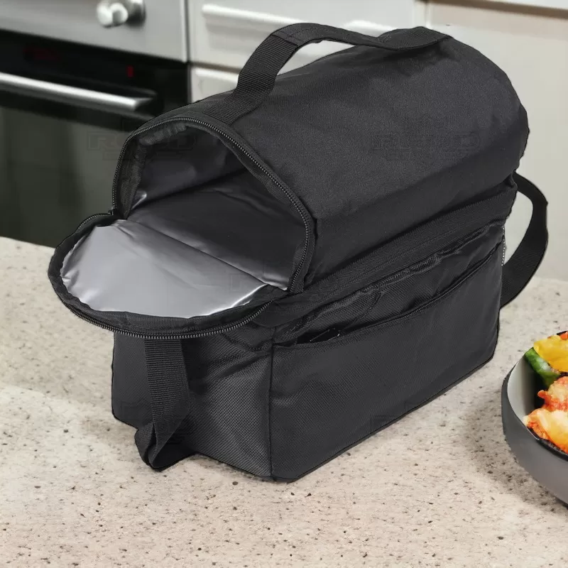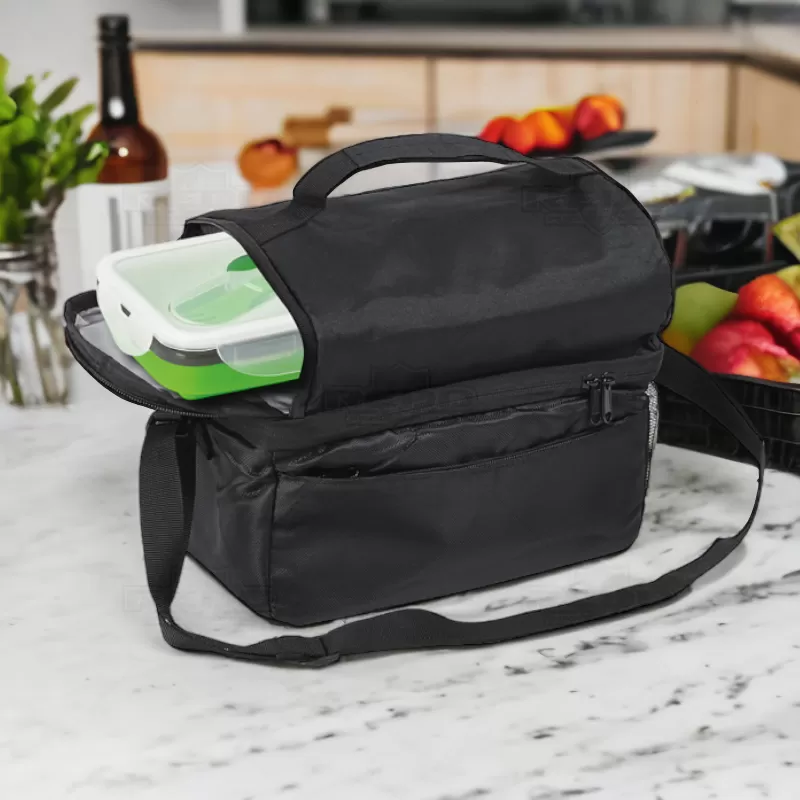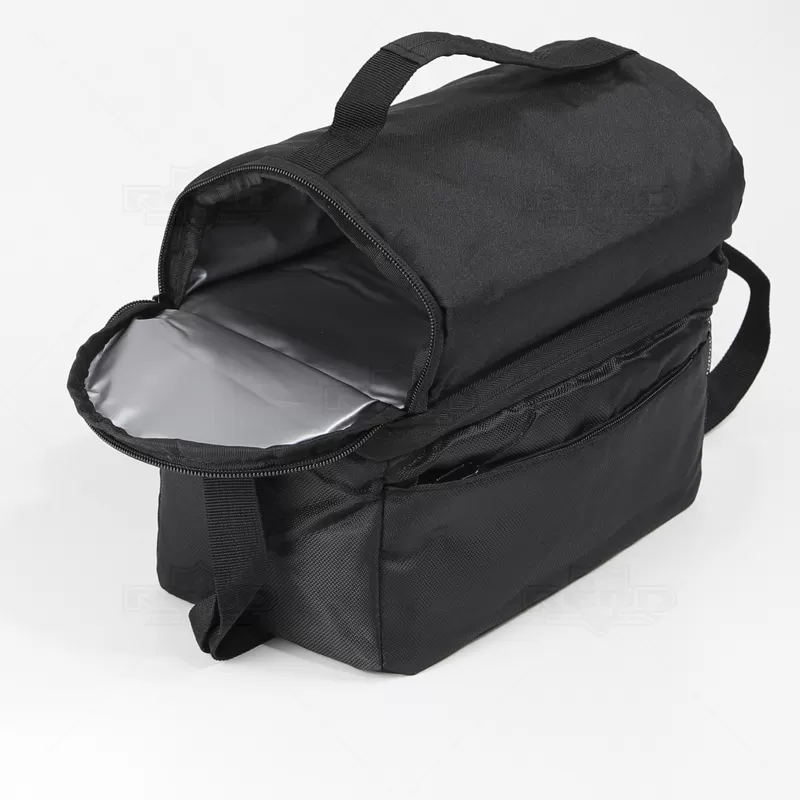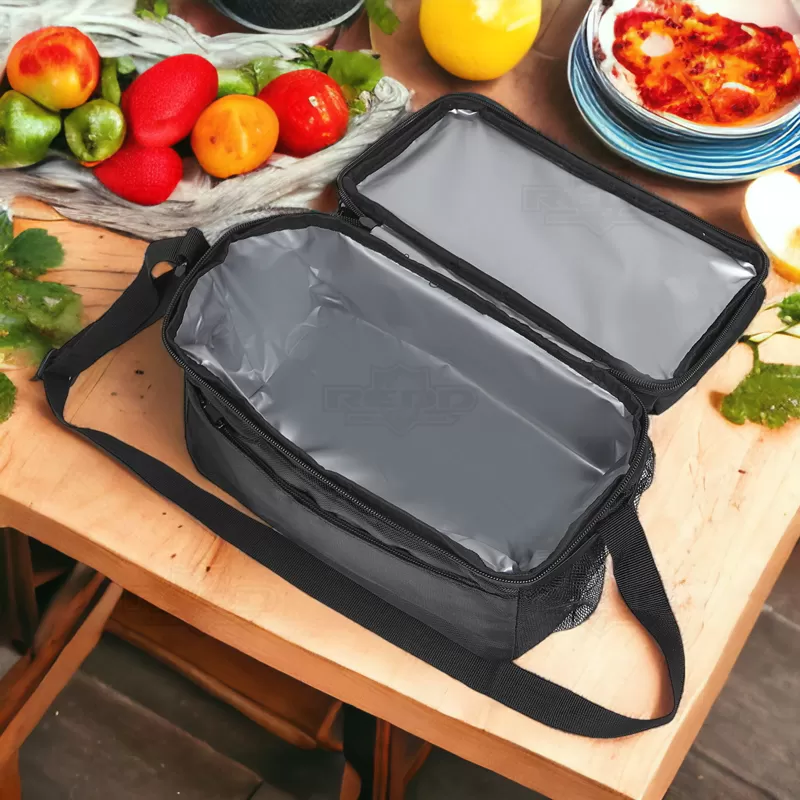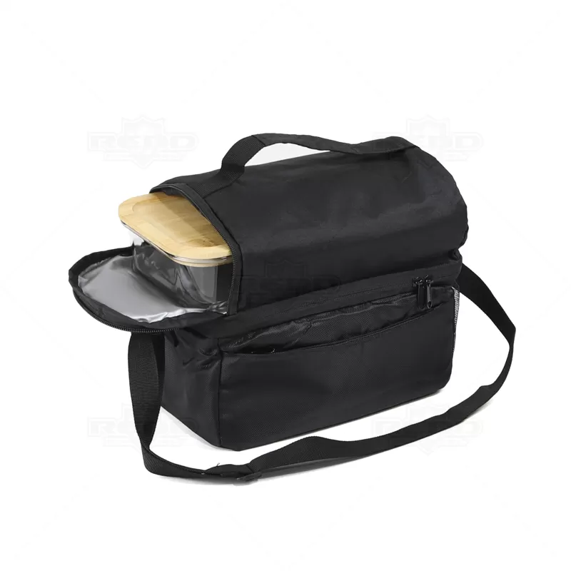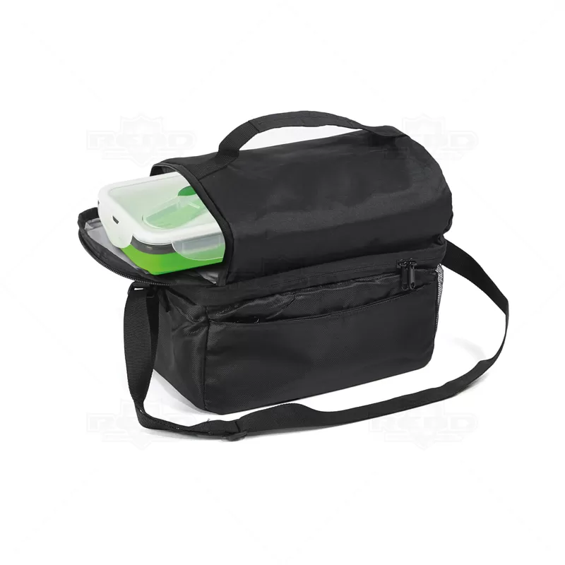 Bolsa térmica em tecido sintético, com interior impermeável para facilitar a limpeza e garantir a conservação dos alimentos. Com capacidade de 7L, oferece praticidade com seus 2 compartimentos principais, bolso frontal com fecho e bolso lateral em rede, proporcionando espaço adicional para armazenamento. Equipada com um bolso de fecho duplo, alça ajustável e pega de mão almofadada, garante conforto e facilidade no transporte. Importante observar que não é recomendado colocar gelo devido ao risco de vazamento pela costura. A imagem é ilustrativa e itens decorativos não estão inclusos, item essencial para brindes promocionais e eventos corporativos, destacando sua marca através da funcionalidade.