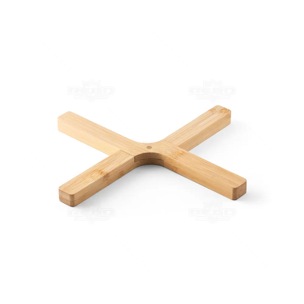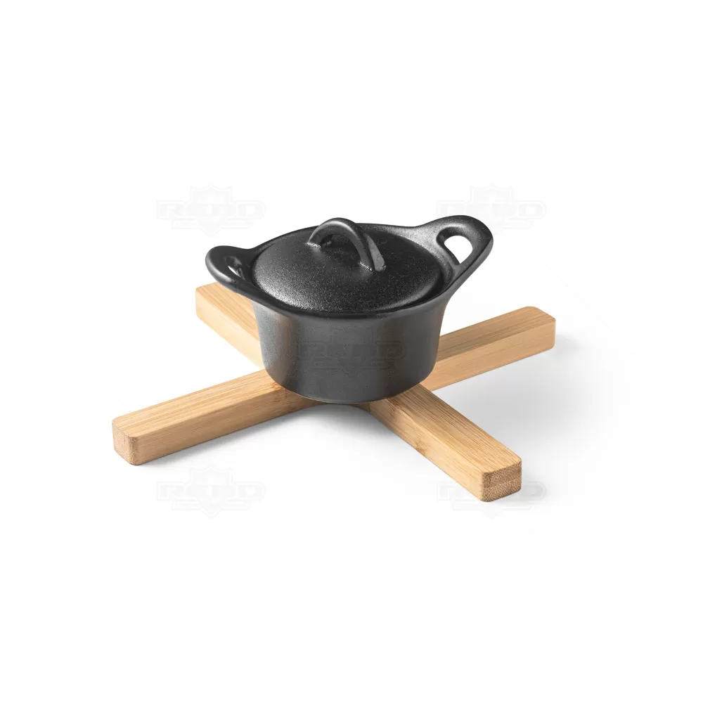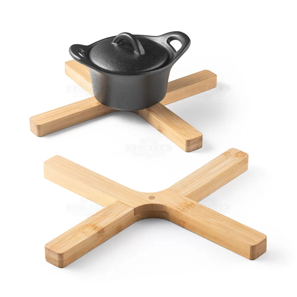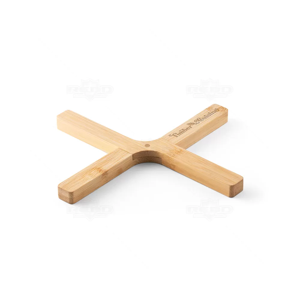 Descanso de panela personalizado, fabricado em bambu de alta qualidade, proporciona uma superfície resistente e isolante para apoiar panelas, frigideiras e travessas quentes. Essencial para proteger mesas e bancadas contra danos por calor, este produto é não apenas funcional, mas também elegante e durável. Ideal para brindes promocionais e eventos corporativos, oferece uma excelente oportunidade para destacar sua marca de forma prática e sustentável, garantindo uma exposição positiva em ambientes culinários e feiras gastronômicas. Fechado: 215 x 40 x 14 mm | Aberto: 180 x 150 x 14 mm. *Imagem ilustrativa, panela não acompanha o produto.