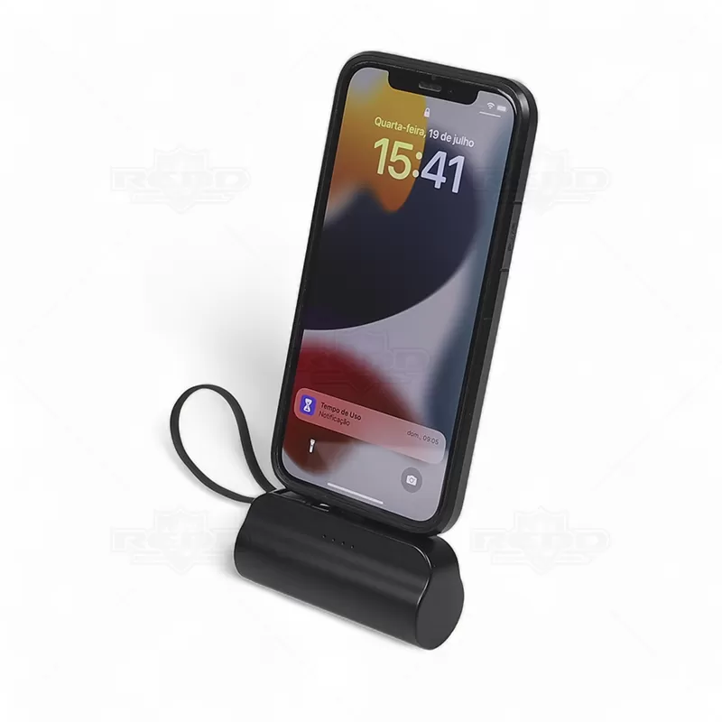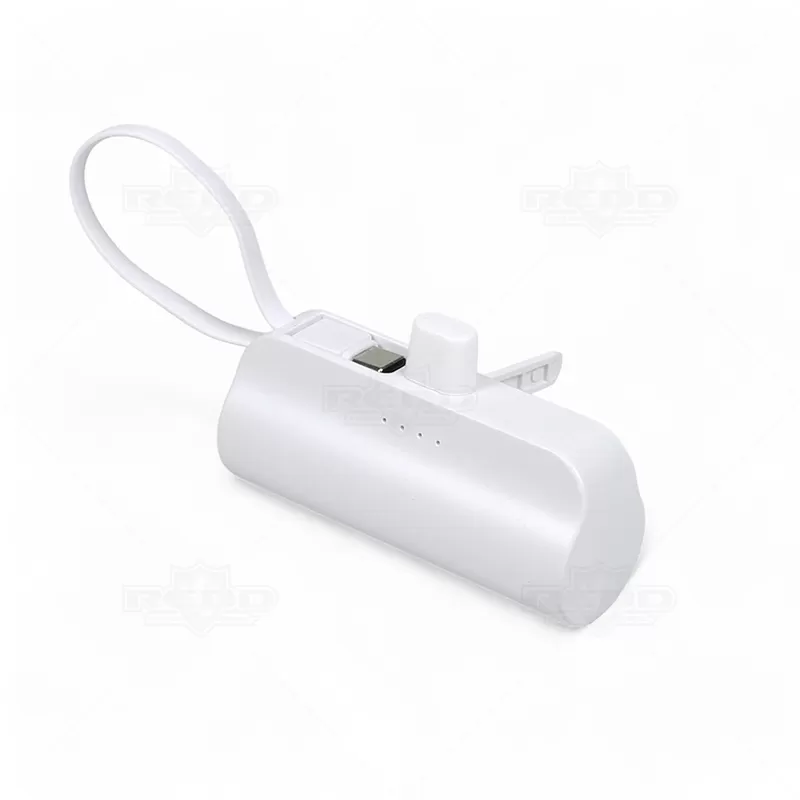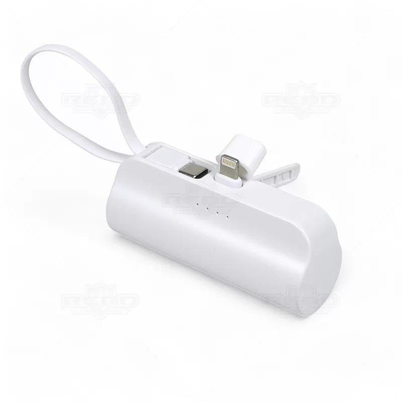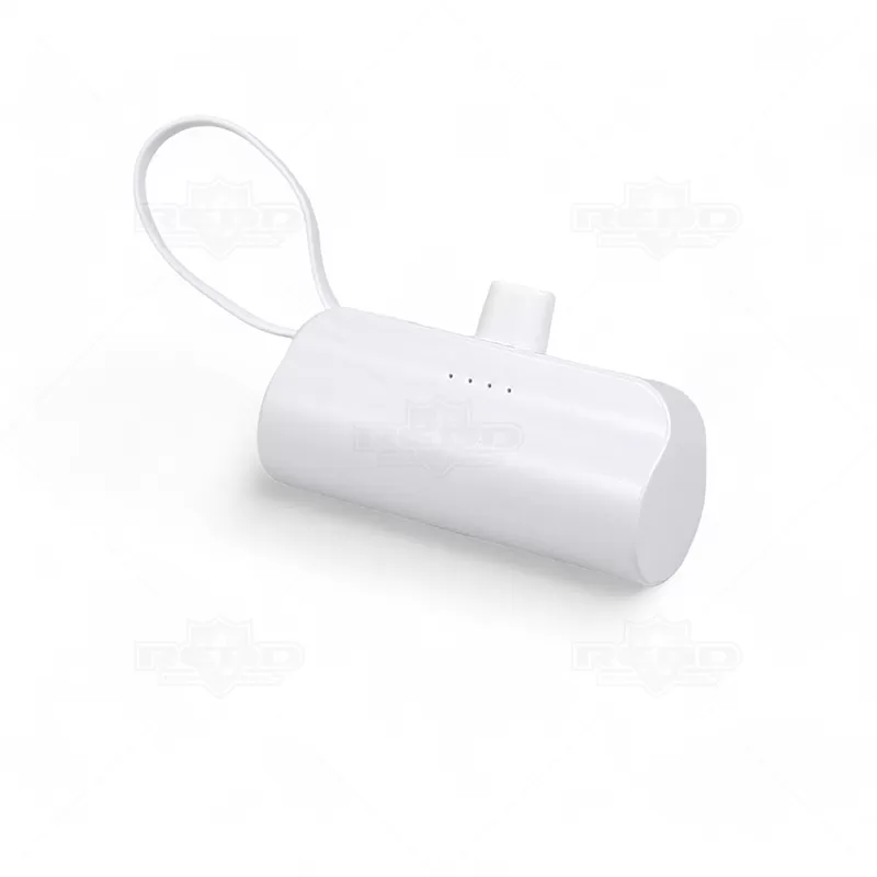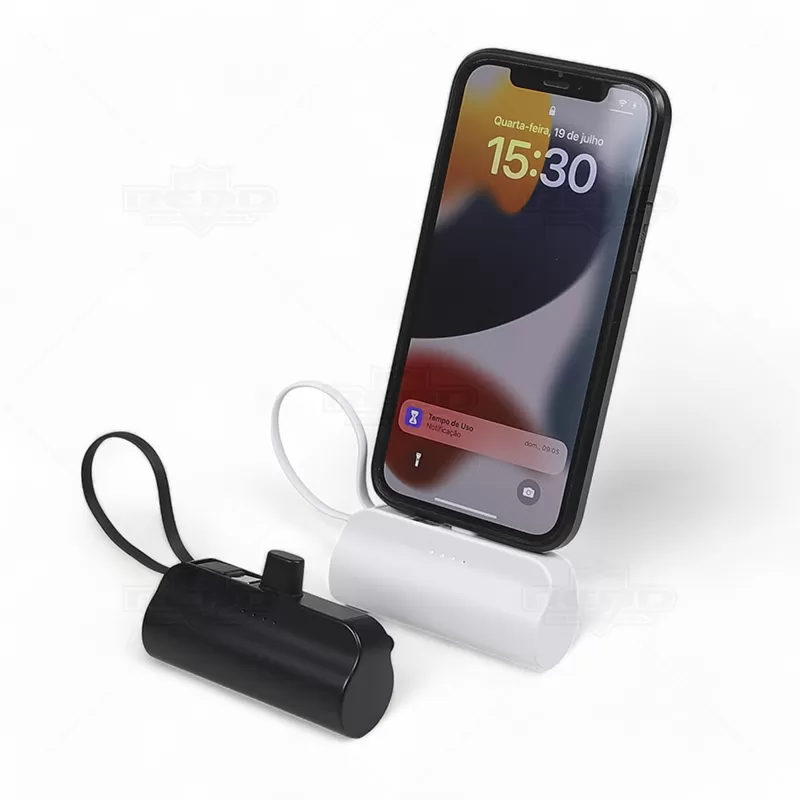 Carregador personalizado portátil e dadas as suas características técnicas pode ser usado em viagens (como bateria portátil). Bateria com indicador de carga LED, possibilita o carregamento de até 2 dispositivos em simultâneo, com entrada TYPE-C e saídas TYPE-C e lightning. Capacidade de 5.000 mAh. Fornecida em caixa presente com cabo incluso (USB/TYPE-C). Tendo a parte externa confeccionada em plástico resistente, podendo personalizar com o seu logo e trazer destaque a sua empresa. O carregador ideal para brindes corporativos e eventos promocionais. Imagem ilustrativa.